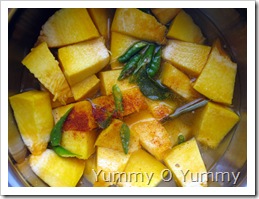 2. In another vessel cook the pumpkin with salt, turmeric, chilly powder, slit green chilies and salt adding enough water to cook the pumpkin. (You can pressure cook it for 1-2 whistles).