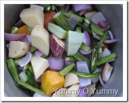 2. Mixed vegetables – 3 cups ( I used potato, carrot, snake gourd, drumstick, onion, yellow cucumber (vellarikka), brinjal and tomato. Cut the drumsticks into 2” pieces and slice them. Wash and cut the other veggies into large cubes. You can use okra/ vendakka also. Cut 2 okra into 1.5 inch pieces, if using).