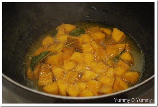 1. Cut the plantain lengthwise. Cover and cook with turmeric powder, slit green chilies, curry leaves, kudam puli and enough salt.