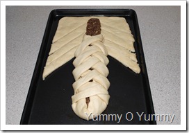 7. With a sharp knife, cut around 8 – 10 strips at an angle on either side of the filling, cutting just to the filling. You will need equal count of strips on both sides.