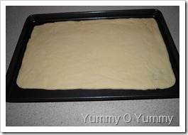 5. Grease a large baking sheet. Punch down the dough and transfer to a lightly floured surface. Knead briefly, then roll out into a 15 x 10 inch (38 x 25 cm) rectangle. Carefully transfer to the baking sheet.