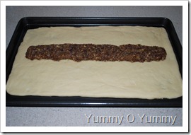 6. Spread the filling in the center of the rolled dough.