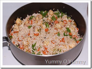 3. Heat 1.5 tbsp oil/ghee in a heavy-bottomed vessel and fry the whole garam masala for a few seconds. Now add the ginger-garlic paste. Fry for a minute and stir in the tomato puree. Saute until oil separates. Add the garam masala powder, cumin powder, chilli powder, little salt and the vegetables (cubed carrots and cauliflower pieces). Saute for 4 – 5 minutes and add the drained rice. Saute for 2 – 3 minutes. Mix in some of the fried onion, chopped cilantro and mint.