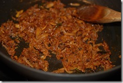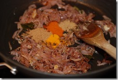 2. Heat 2 – 3 tbsp coconut oil in a wide non-stick pan or kadai/ cheena chatti over medium-high heat and splutter the mustard seeds. Add sliced onion and little salt. Saute until onion turns transparent. Add ginger-garlic paste(or chopped ginger and garlic), green chilly, if using and curry leaves.Continue to saute until onion turns golden, takes about 10 minutes. Bring down the heat to low. Now add all the masala powders (numbered 8 – 12). Stir for a couple of minutes until their raw smell completely leaves and oil separates. You can sprinkle a little water to avoid the masala powders from getting burnt. Next add the chopped tomatoes and enough salt. Cook for 5 – 6 minutes until they get completely mashed up and oil separates. Add 1/4 cup hot water and a pinch of sugar, if using. Mix well and taste-check for salt. Now add the egg halves. Mix them carefully with the masala. Cover with the lid and cook for one minute over very low heat. Switch off. Egg roast goes well with appam, idiyappam, chapathi and porotta. Enjoy!