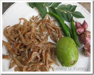 3. Combine the dried prawns, mango slices, crushed coconut mixture, curry leaves and salt in a kal chatti or man chatti. Add little water. Mix everything well. Cover and cook until it gets dry. Add 2 tsp coconut oil and a few curry leaves. Mix well and switch off. Serve hot with rice.