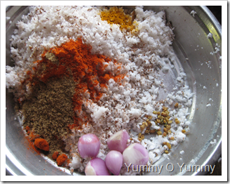 2. Crush the grated coconut with turmeric powder, chilly powder, fenugreek powder/seeds and coriander powder. Add the sliced pearl onions and crush the whole mixture with your fingers (njeruduka).