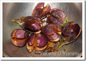 3. Heat oil in a deep pan at medium heat. When the oil is hot enough, bring down the heat and splutter mustards and brown the fenugreek seeds. Immediately add the egg plants. Fry them at medium – low heat adding little salt and turmeric powder. Turn them around and fry all the sides. Take care not to burn the mustards and fenugreek seeds, they will taste bitter if blackened. When the egg-plants are fried on all the sides, increase the heat to medium, add tamarind juice, curry leaves, the remaining spice powder and salt to taste. Cover and cook turning them in between, until the gravy gets thick and you can see oil on top of the curry. It takes about 15 minutes. Add 1/2 – 1 tsp grated jaggery and 1 pinch of hing. Switch off and set aside for 15 minutes. Serve with rice, poriyal and pappad. It tastes better the next day.