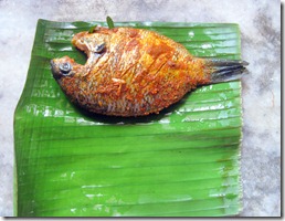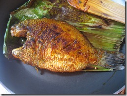 3. Heat a banana leaf over low flame for a few seconds, so that it will be pliable and won’t tear while wrapping the fish. Grease it. Wrap the masala coated fish in the greased banana leaf and tie with a banana string tightly like a parcel so that steam wont escape. Here is a video that shows how to wrap it in a banana leaf. Cook the fish in a hot pan, about 15 minutes, flipping to the other side in between at medium heat. Serve hot with rice.