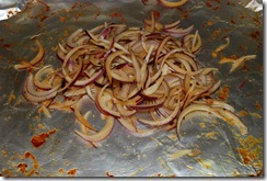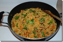 4. Heat 1.5 tbsp oil / butter in a wide non-stick pan. Fry cashews, raisins, sliced onion (if using)one after the other until golden and set aside. Pour more oil if required and then add ginger-garlic paste and fry for a minute or two. Next add thinly sliced onion (for an extra taste, you can coat the thinly sliced onion with the  baked fish drippings in the aluminium foil), little salt and saute until onion turns light brown. Add turmeric powder, chilly powder, pepper powder and fry for a few seconds. Next add chopped tomato pieces and saute until tomato gets mashed up and oil separates. Add in the fish pieces, garam masala powder, chopped mint leaves and chopped cilantro. Mix everything well and stir for 1 – 2 minutes. Next add the cooked rice little by little and mix well. Stir-fry for 3 – 4 minutes. Switch off. Garnish with fried cashews, raisins, onions, chopped cilantro and mint leaves. Serve with raita and a pickle.