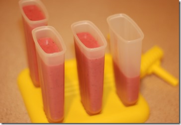 If you do not have a popsicle mold you can also use small paper cups, wooden sticks or small spoons and aluminum foil, as shown in the pictures below. Cover the paper cups with aluminum foil and make a small slit on top of the foil in order to put the wooden stick or spoon, if using(the foil will help support the stick until the popsicle freezes) OR place the paper cups in the freezer for about 45 minutes, then gently poke a popsicle stick or small spoon into the center of each one. Place back in the freezer for at least 4 hours, or until firm.