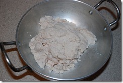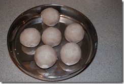 2. Drain and grind soaked rice along with cumin seeds in a grinder/food processor/blender adding water little by little until you get a coarse mixture. (Add water only if required). Add grated coconut, pearl onions, enough salt and pulse a few times (do not grind to a paste). Transfer the dough to a plate. Make large balls out of it and steam for about 25 – 30 mts or until done. Set aside to cool. This recipe makes 8 – 10 large kozhukattas. Quarter the prepared kozhukattas and set aside.