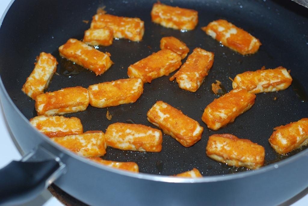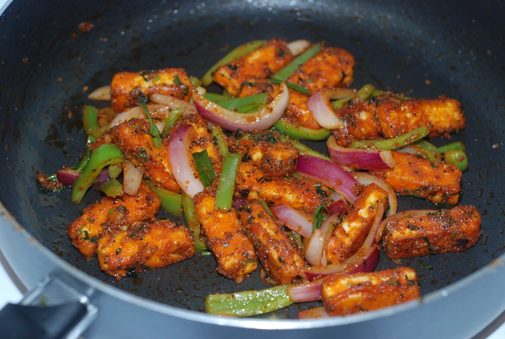 1. Combine all the ingredients for the batter (ingredients numbered 11). Taste-check for salt. Coat the paneer pieces with this marinade and fry in 1.5 – 2 tbsp oil on all sides until golden brown in color. Transfer to a plate lined with paper towel.