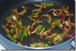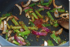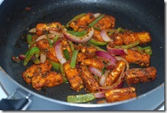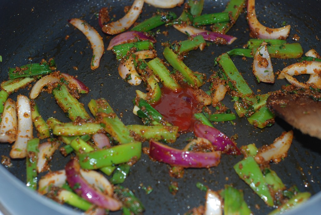 2. Heat 1.5 tbsp butter in the same pan at medium-low heat and add ginger-garlic paste. Stir for a minute. Next add coriander powder, chilly powder, coarse ground pepper and amchur powder. Cook until their raw smell leaves. Add finely chopped cilantro followed by onion, bell pepper and spring onion. Add salt to taste. Saute at medium heat for 4 – 5 minutes. The veggies should not lose their crunch. Add 1.5 tsp tomato ketchup and mix well. Finally add fried paneer pieces and mix everything well. Serve paneer do pyaza with pulav/ chapathis.