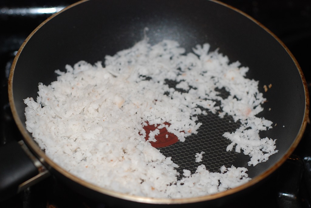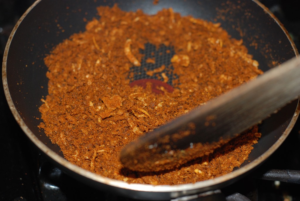 1. In a pan at medium-high heat, roast grated coconut until golden-brown stirring continuously. Bring down the heat to low and add chilly powder, coriander powder and fenugreek powder. Stir for a minute and switch off. Cool down and grind to a very fine paste adding little water.