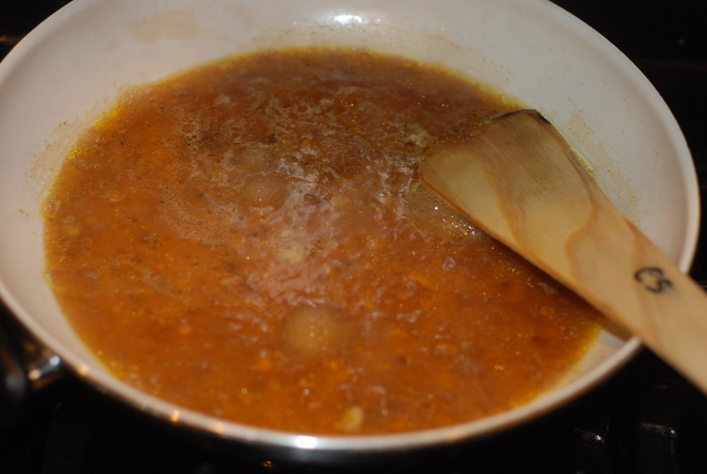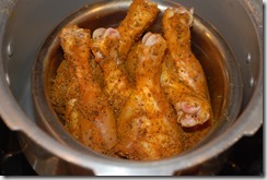 2. Place the chicken drumsticks inside a small steel vessel. In a pressure cooker, pour around 1.5 cup water and place the steel vessel inside. Pressure-cook for 6 – 7 whistles or until the chicken pieces are completely cooked. Open after 10 – 15 minutes or after pressure releases. The chicken would have released around 3/4 cup water and some fat also. Alternatively, you can steam the chicken drumstick for around 15 – 20 minutes.