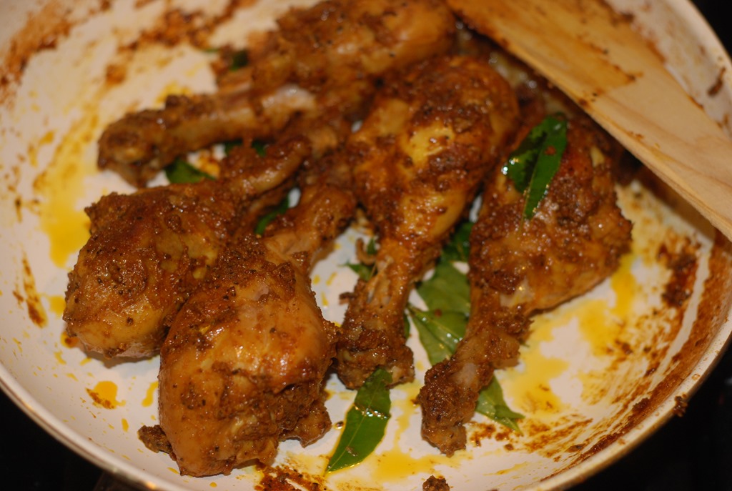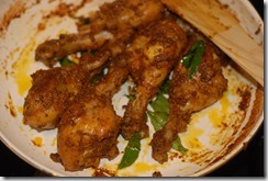 3. Pour the chicken stock in a non-stick pan and heat until 80% of the liquid dries up. Add the chicken drumstick pieces, 2 tsp coconut oil (add more if you prefer), few curry leaves, 2 – 3 cloves of crushed whole garlic, slit green chilies and cook for 1 – 2 minutes on all sides over low medium heat until the chicken is roasted well. Serve hot.