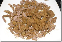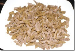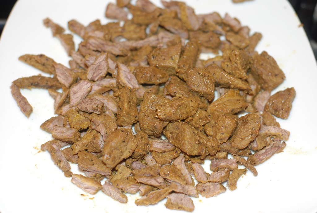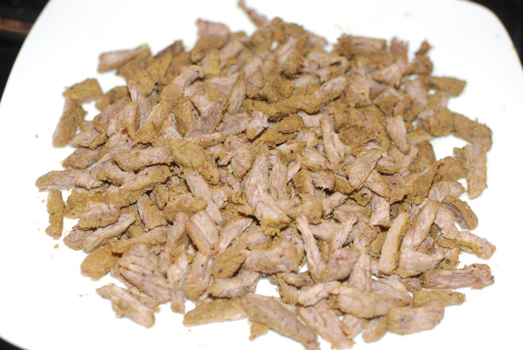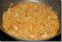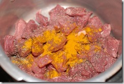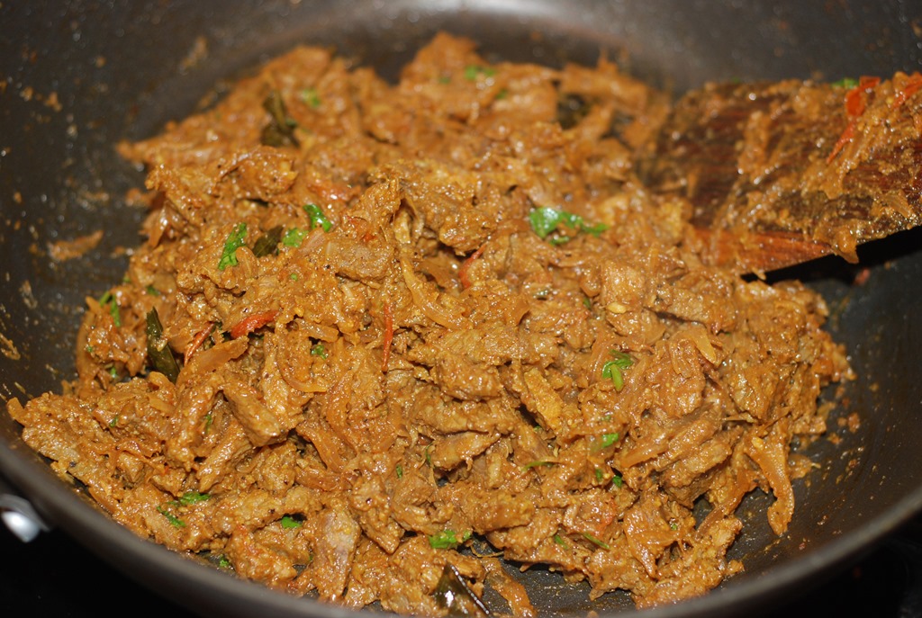 1. In a pressure cooker, add in the beef pieces, 1/2 tsp turmeric powder, 1/2 tsp pepper powder, 1/4 cup water and enough salt. Mix well and pressure-cook for 3 – 4 whistles (cooking time depends on the type of beef used). Switch off. When pressure releases, open the pressure cooker. Set aside the stock. When the beef pieces are warm enough to handle, cut into thin pieces using kitchen shears. Set aside.