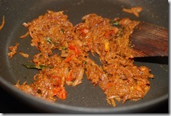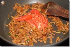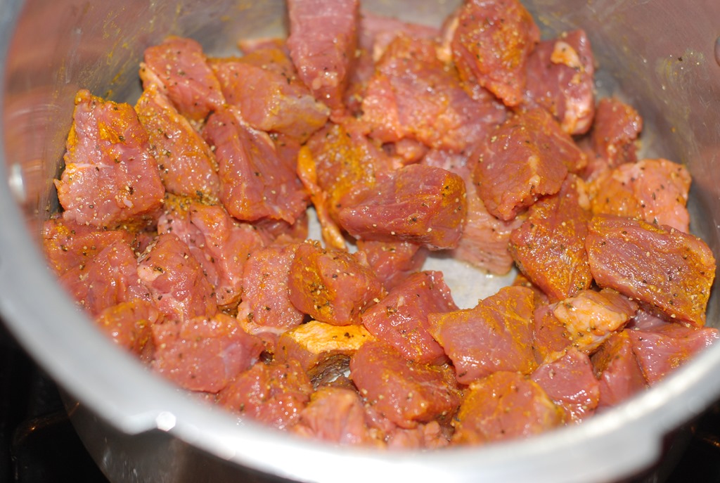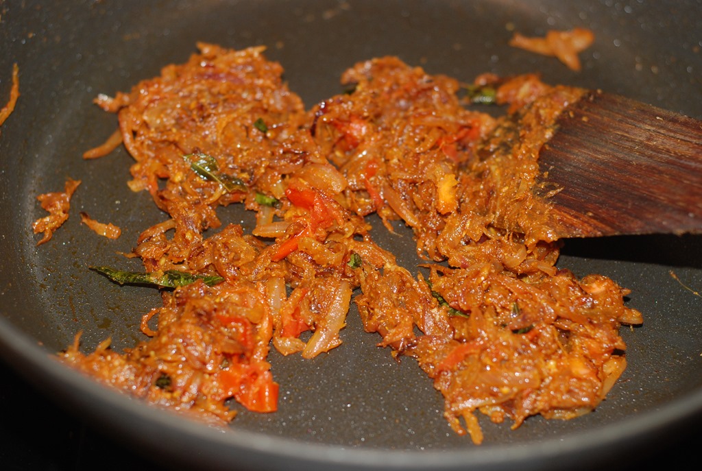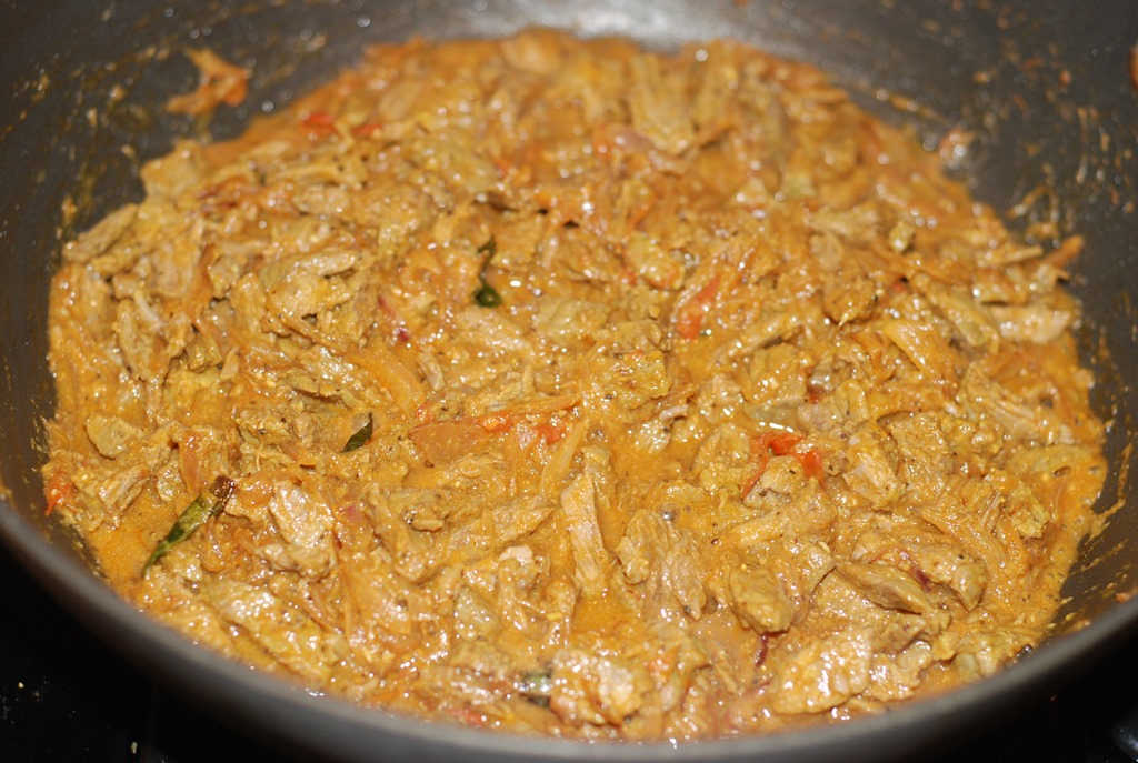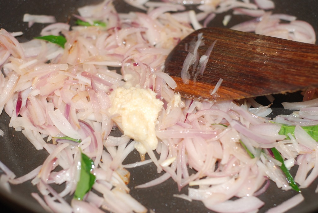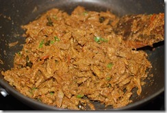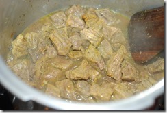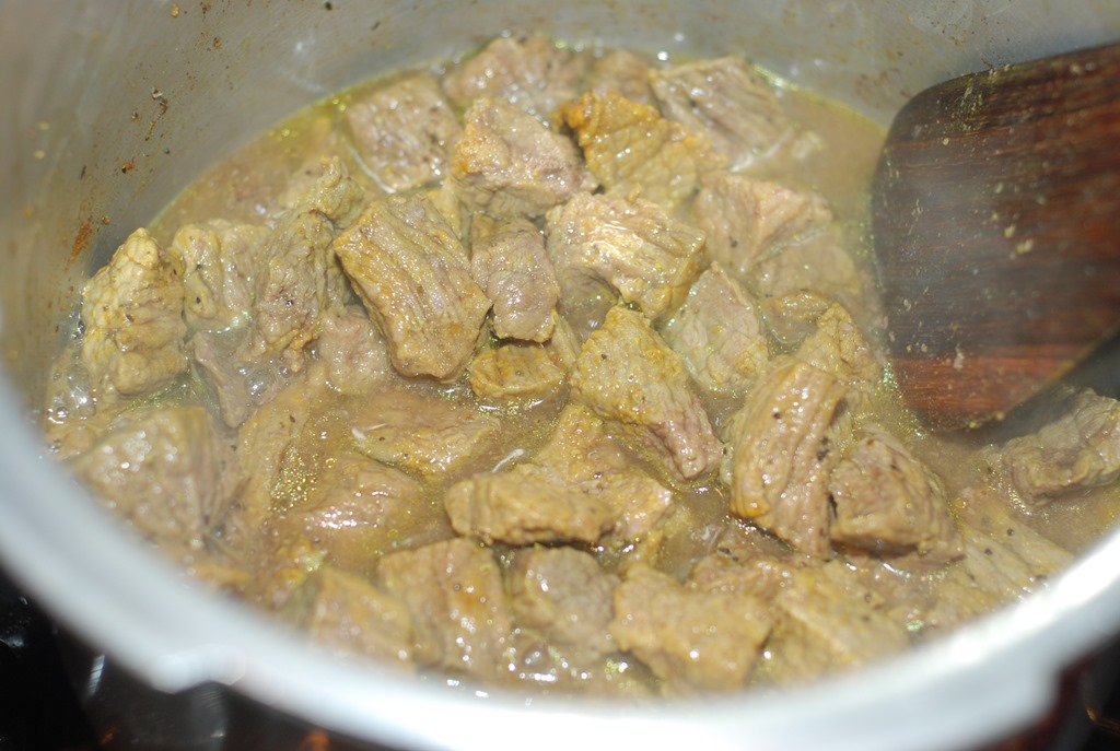 3. To prepare the beef gravy – Heat 2 – 3 tbsp coconut oil in a pressure cooker. Add onions, few curry leaves, little salt and sauté until transparent. Next add ginger-garlic paste, mix well and sauté until onion turns light golden. Add the spice powders – turmeric powder, chilly powder, coriander powder, pepper powder and garam masala powder. Mix well and stir at low heat until their raw smell is gone. Next add tomato slices and cook until tomato turns mushy. Add beef pieces, meat masala powder and the beef stock that you set aside. Mix well. Cook covered over medium low heat until the beef pieces are completely coated with the gravy. Sprinkle chopped cilantro, little chopped mint and mix well.