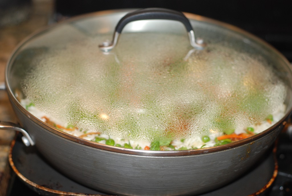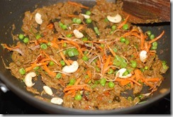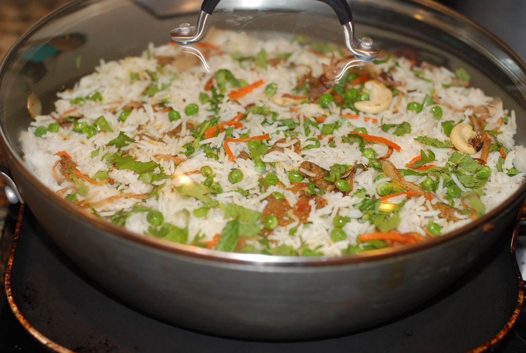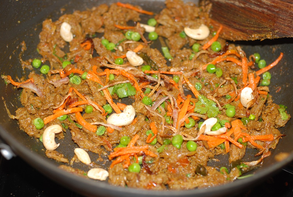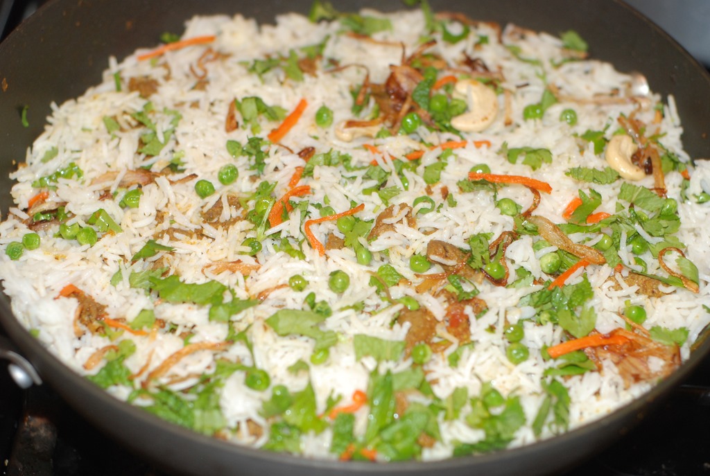 Deep-fry the thinly sliced onions, carrots, fresh green peas and cashews separately and drain on to a paper towel. Set aside until ready to layer.