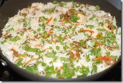Draining method – Soak the basmati rice for around 20 mts. Boil water in a deep vessel. To the boiling water add ghee – 2 tsp, whole spices (cardamom – 4, cloves – 5, cinnamon stick – 1 inch). Add enough salt. The water should be slightly salty. Now add the soaked rice and cook it to the perfect consistency. It will take around 15 – 20 mts at medium heat. Drain the water and set aside.