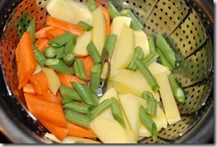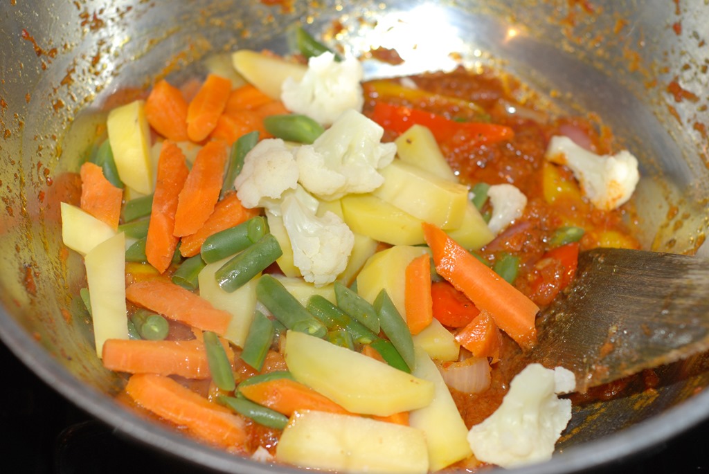 1. Boil or steam carrot, green beans and potato pieces for 5 – 6 minutes. Add cauliflower pieces and continue to cook until the vegetables are almost done. Set aside.