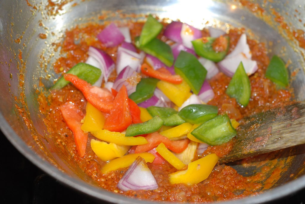 2. Heat 2.5 tbsp oil in a kadai / any heavy-bottomed vessel. Add finely chopped onion and little salt. Saute until transparent. Add ginger-garlic paste, slit green chilly and continue to saute until onion starts to change color. Add turmeric powder and 1 – 1.5 tsp kadai masala. Mix well and add ground tomatoes. Add salt, to taste and cook covered for a few minutes until oil separates. Add cubed onion and bell pepper. Mix well and cook for a minute. Add 1/4 cup hot water. Cover and cook for a couple of minutes. Next add the cooked vegetables. Cover and cook for a coupleof minutes. Add paneer pieces and again cook for a minute. Switch off the stove. Sprinkle a fat pinch of kadai masala, 1/4 cup chopped cilantro and serve hot with chapathis.