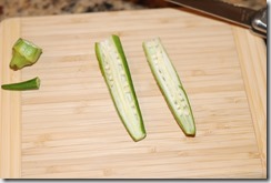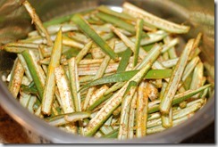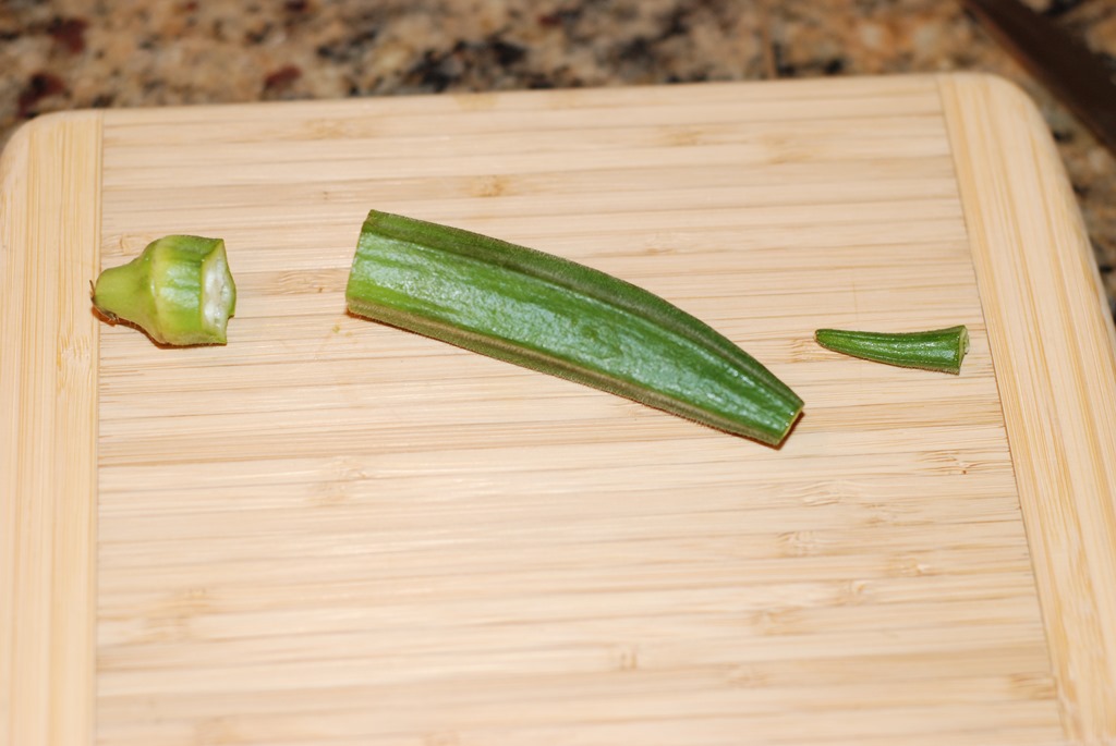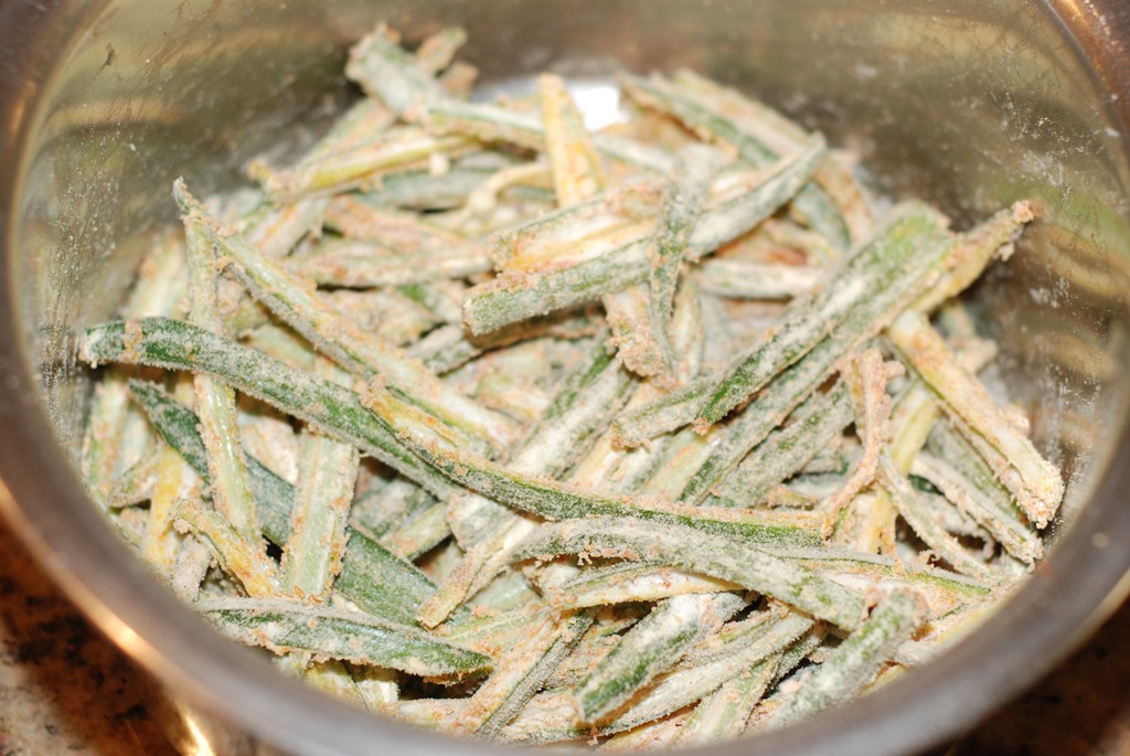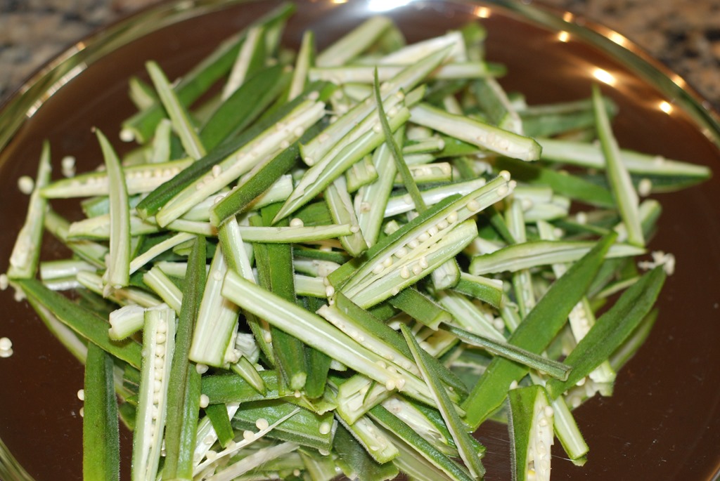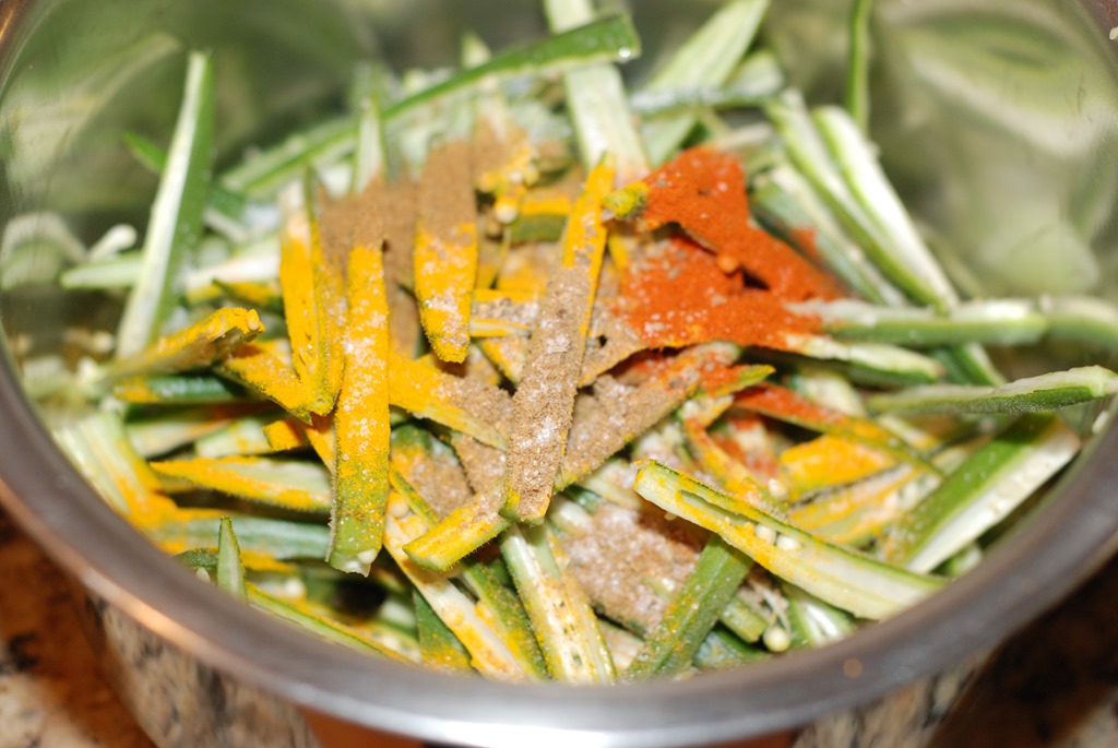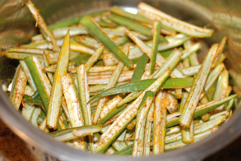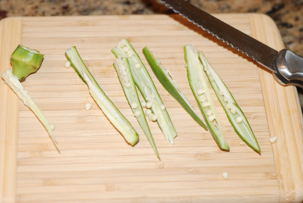 1. Wash the okra well and pat dry. Slice them lengthwise and cut into very thin slices. Transfer to a deep bowl and toss them lightly. Remove the okra seeds that settle at the bottom.