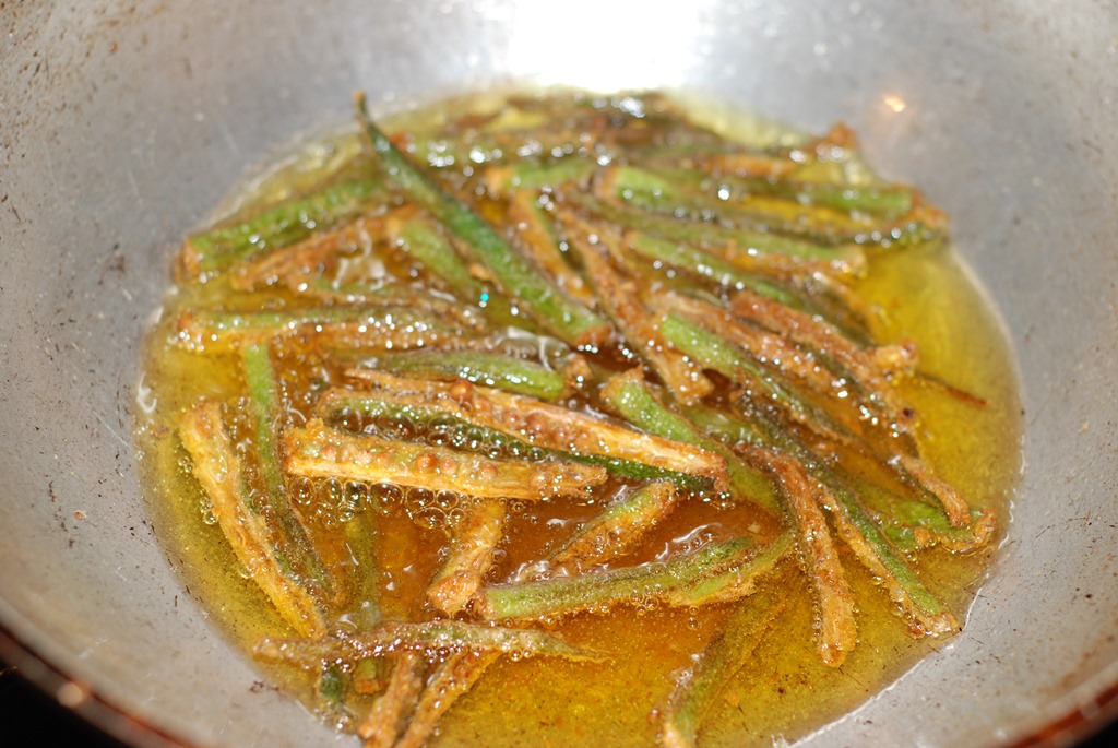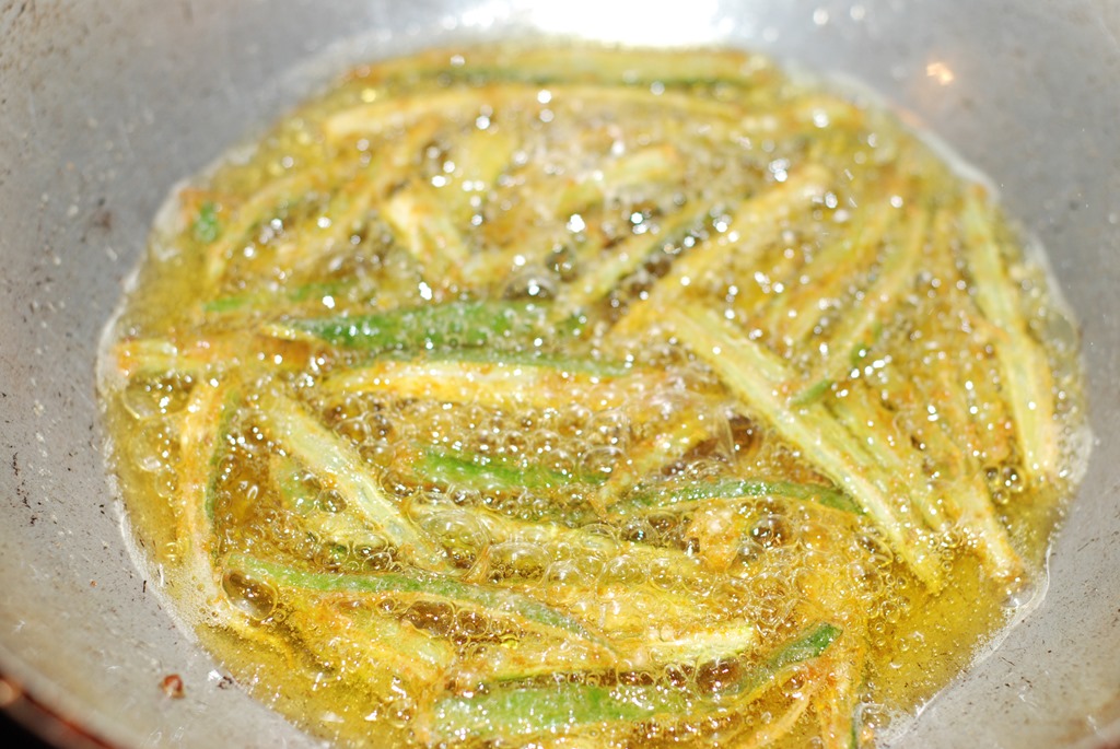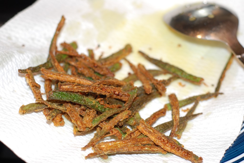 4. Heat oil over medium-high heat and deep-fry the okra slices in 2 – 3 batches, for 4 – 5 minutes until golden brown and crispy. Remove them to a paper towel. You can have it with rice and other side-dishes or as a snack..
