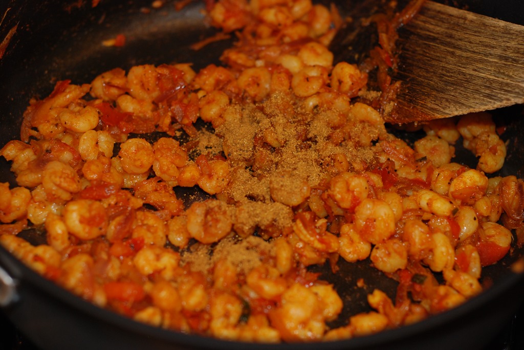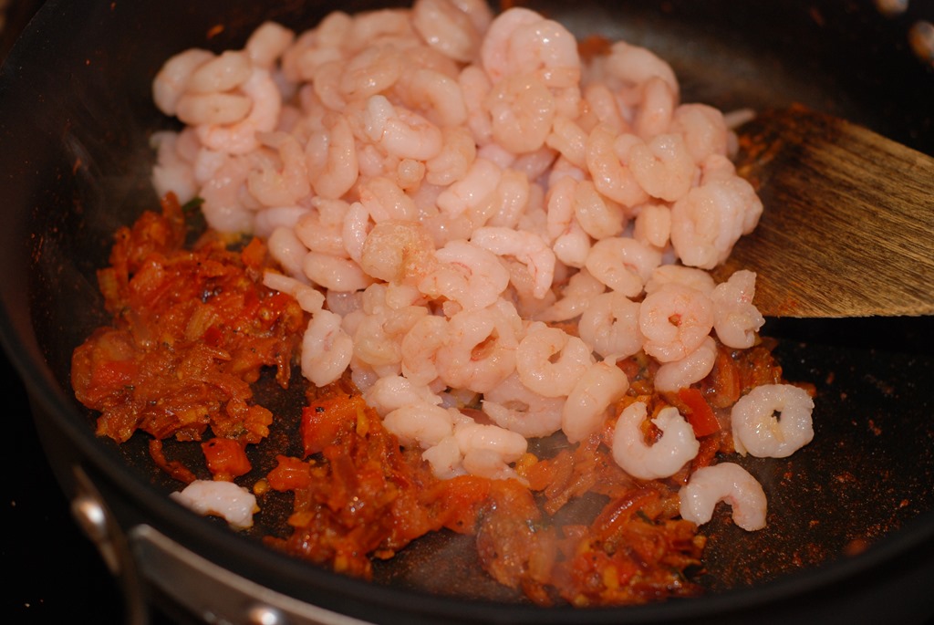 1. Heat 1 tbsp oil in a pan and add the onion, ginger, garlic, curry leaves and a pinch of salt. Saute until onion begins to change color. Add turmeric powder, chilly power and pepper powder. Saute for a few seconds until their raw smell leaves. Add chopped tomatoes and cook for 2 minutes. Next add prawns, salt and saute until the moisture completely evaporates, about 2 – 3 minutes. Add garam masala powder and cook for a minute. Add cilantro and mix well. Switch off. Set aside to cool.
