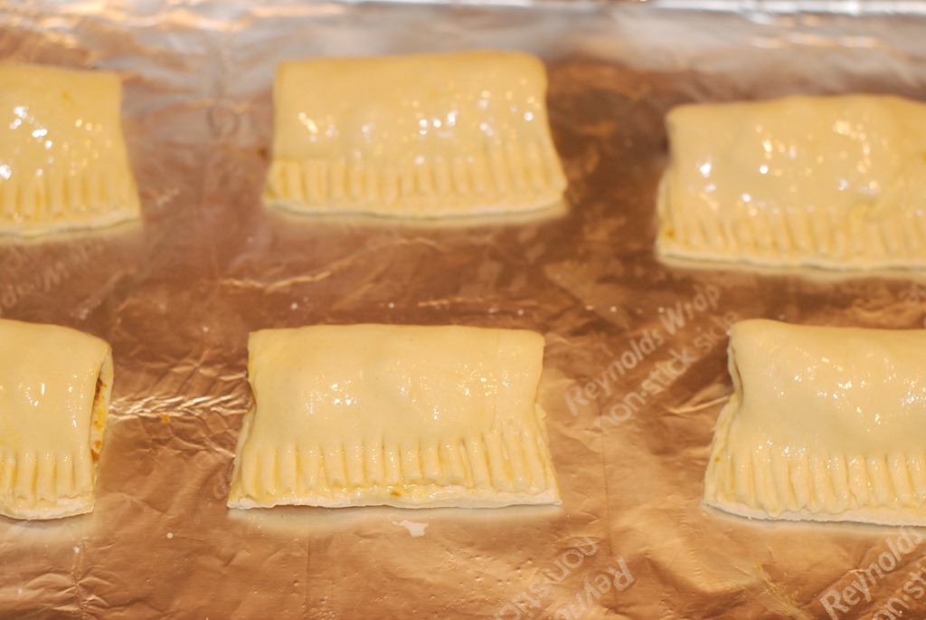 2. Thaw the puff pastry sheets as instructed in the package. (I used pepperidge farm puff pastry sheet.) Each packet has 2 puff pastry sheets. You can make 6 puffs from each sheet. Cut the puff pastry sheet into 6 equal parts. Put 1.5 – 2 tbsp prawn masala in the center of each pastry. Seal the puffs using your fingers. Arrange the prepared puffs on a baking sheet lined with foil/ aluminium paper or greased with oil. Lightly beat the egg white and brush it on top of the stuffed puff pastries. Preheat the oven to 400 F and bake for 15 – 20 minutes or until the puffs turns golden brown on top. Serve warm with with ketchup.