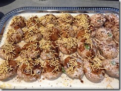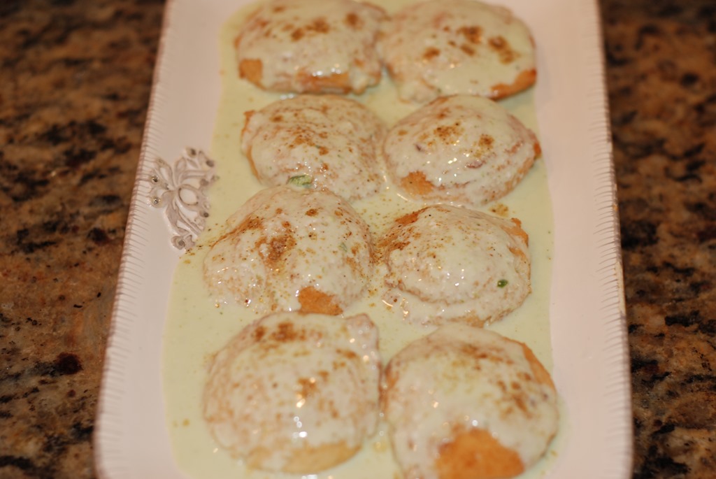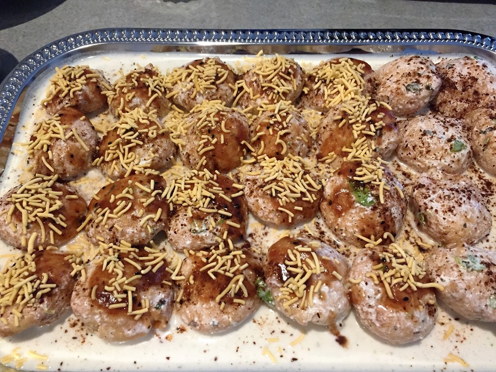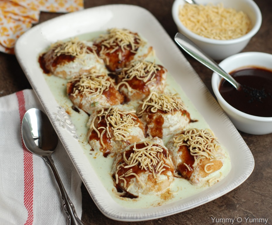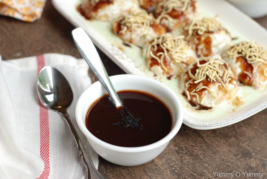 4. An hour before you are ready to serve, top the vadas liberally with the spiced yoghurt followed by little tamarind chutney, a pinch of roasted cumin powder and chat masala. Keep it aside for 30 minutes. Sprinkle sev right before serving. Serve with tamarind chutney, spiced yoghurt, chat masala and sev. Leftovers can be refrigerated for 1 – 2 days.