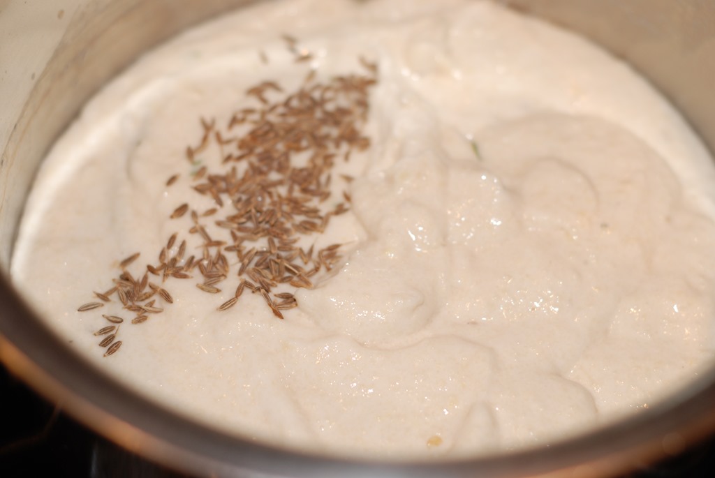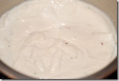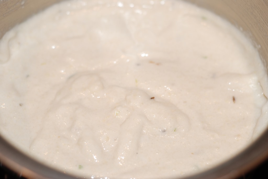 1. Grind 1 – 2 tbsp yoghurt with 2 green chilies and 1/4 cup cilantro to a very smooth paste. Add it to the remaining yoghurt. Add enough water to make it pouring consistency. Add a tsp of sugar and mix well. Set aside.