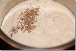 3. Grind the urad dal along with 3/4 inch chopped ginger, 2 – 3 green chilies and salt to a coarse paste. Add little water, if required. Transfer to a container. Add cumin seeds and whisk the batter thoroughly with your hands in a circular motion for 4 – 5 minutes until the batter is light and fluffy.