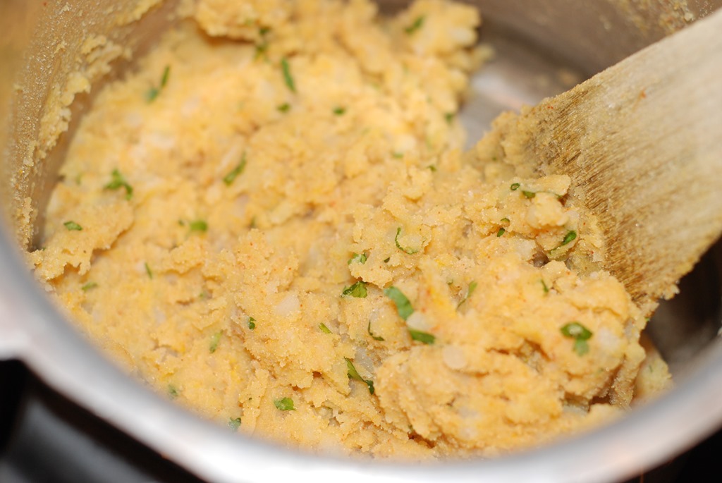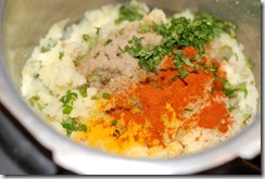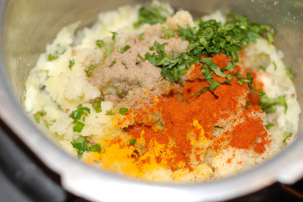 2. For the stuffing – Halve the potatoes and cook in a pressure cooker for 1 – 2 whistles or any pan adding enough water, until soft. Remove the peel and mash completely. Combine it with all the other ingredients numbered 2 and mix well. Your stuffing is ready. (For an extra taste, you can saute the aloo mixture in 1.5 tbsp oil for 6 – 8 minutes until fried well)