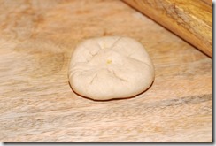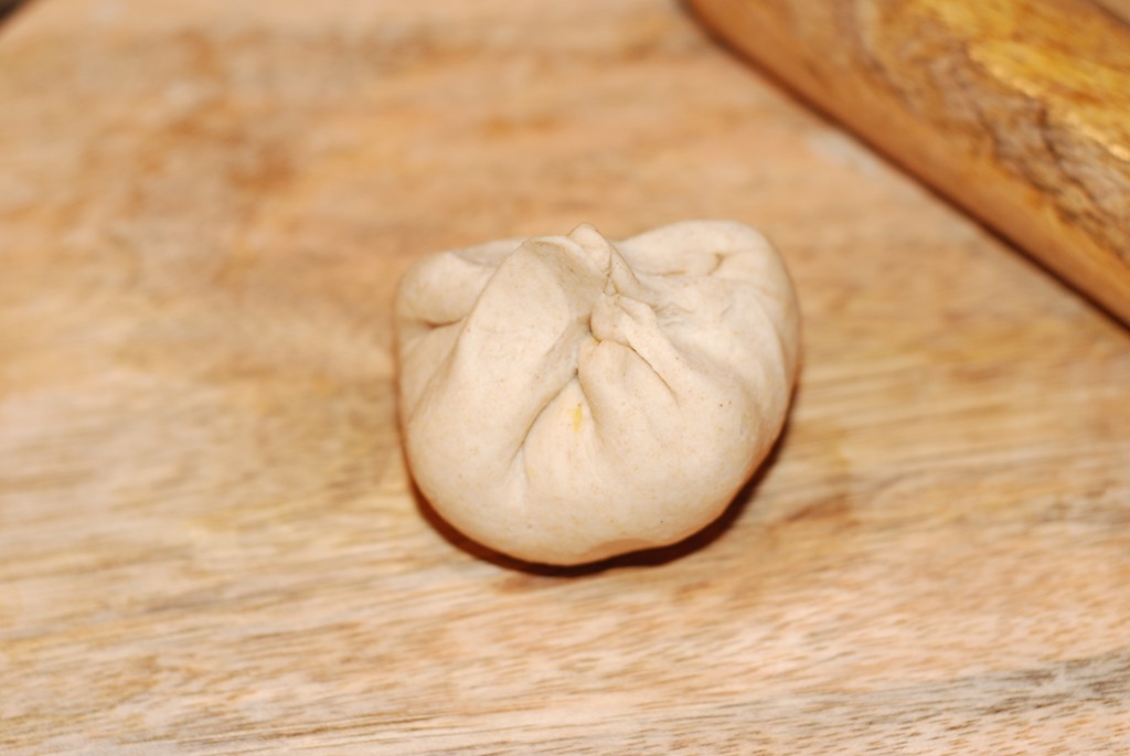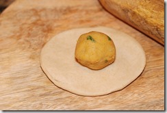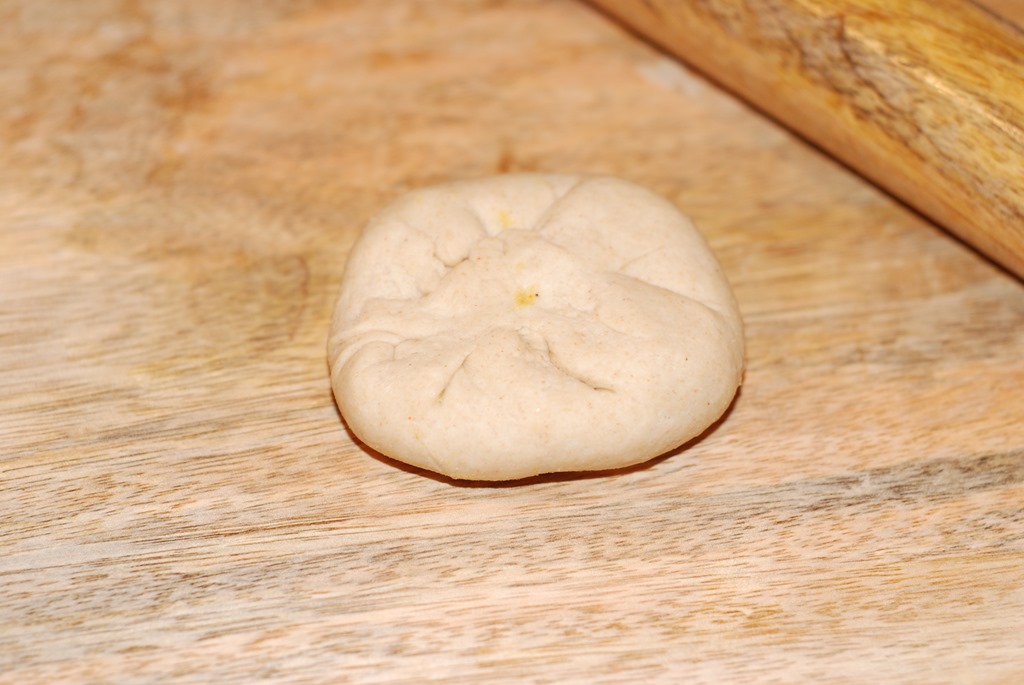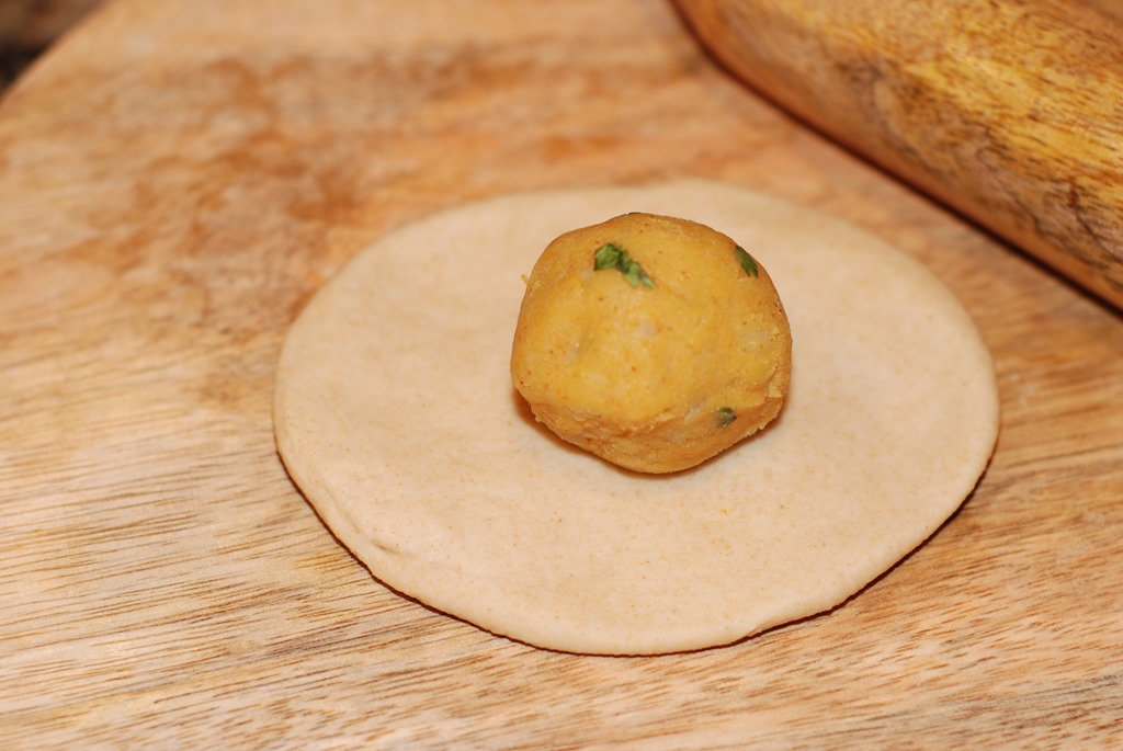 4. Now take one atta ball. Dip into dry whole wheat flour and roll to form a 3″ diameter circle. Place a stuffing and bring the edges of the dough to the center and cover the stuffing.