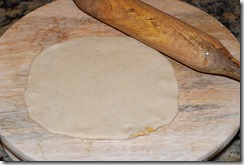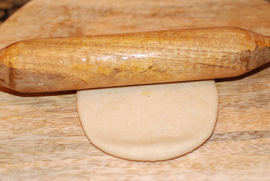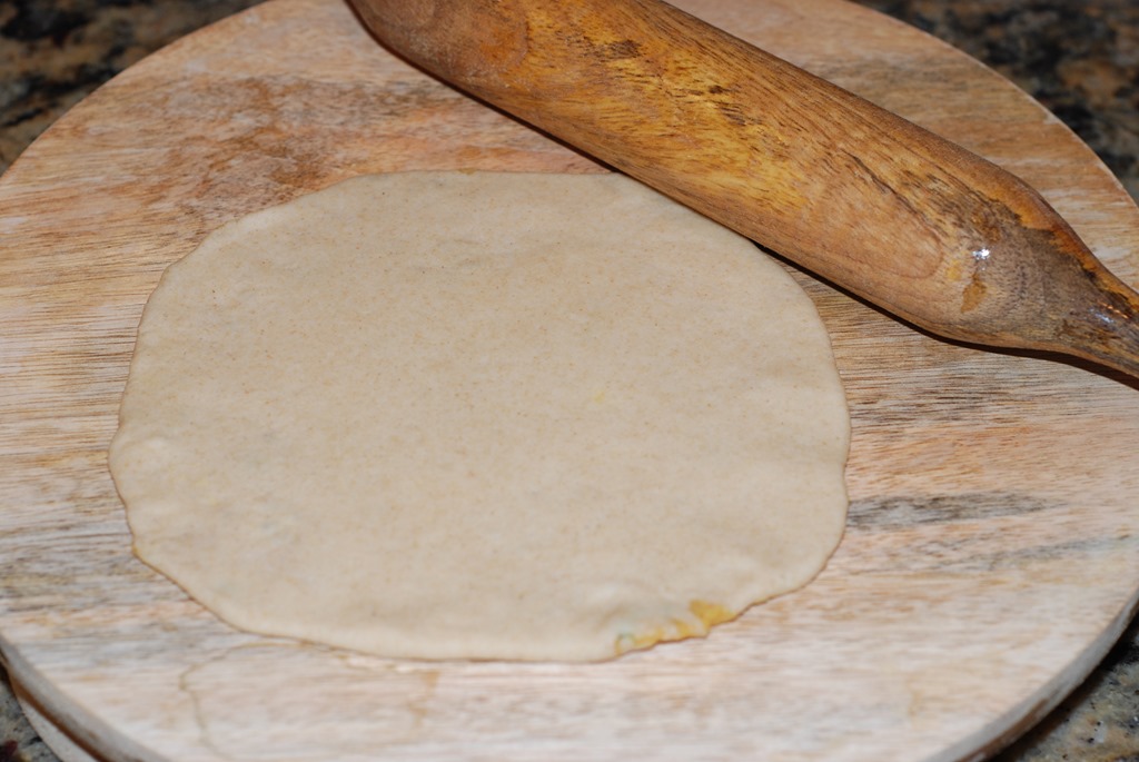 4 Dust the working surface with some atta flour and roll out the stuffed dough to form a circle.