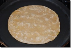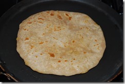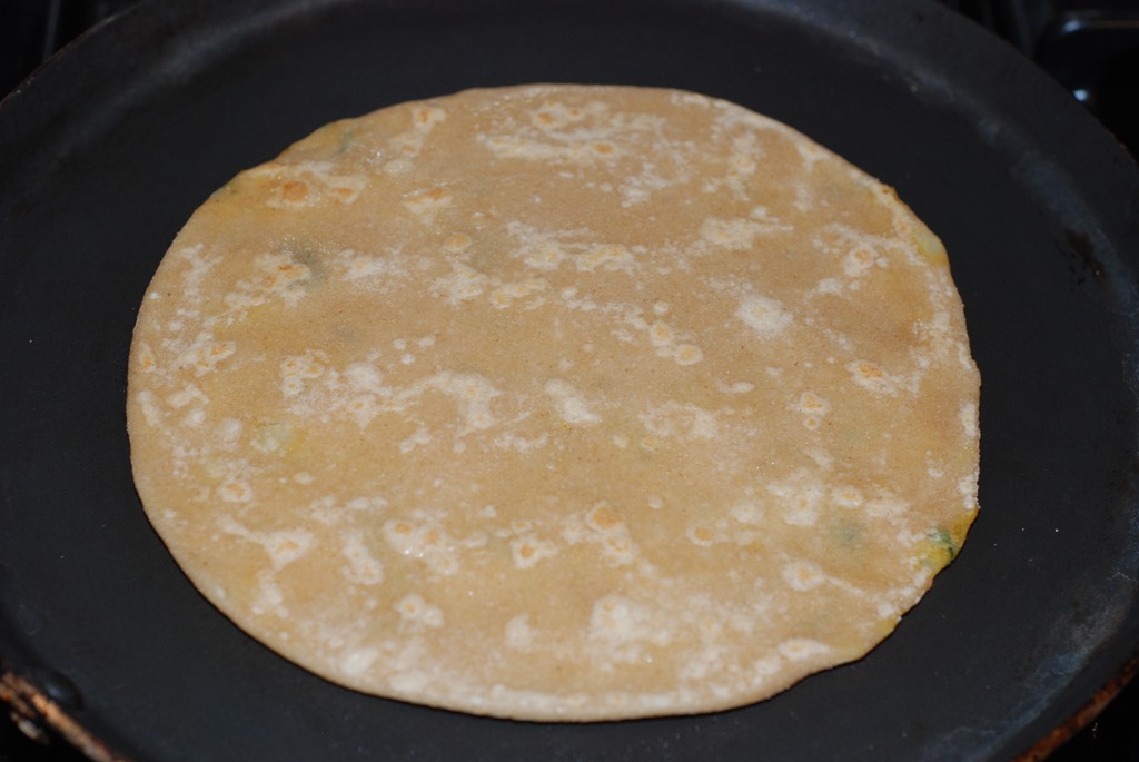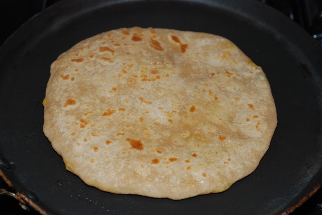 5 Heat a tawa and once its hot, place a paratha and let it cook for 15 secs. Flip the paratha and let it cook for a few more secs. Once light brown spots appear, drizzle some oil or ghee and roast to a golden shade on both sides. Use a spatula to press the puffed areas as the paratha gets roasted.