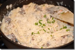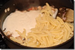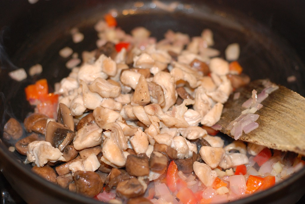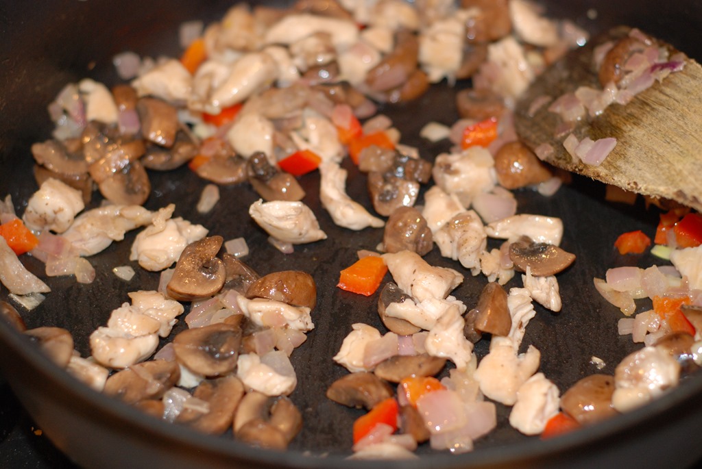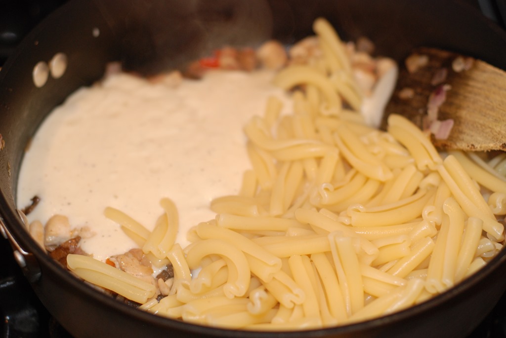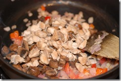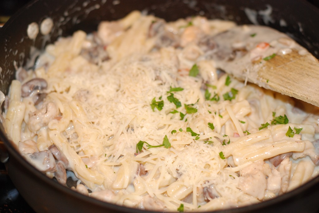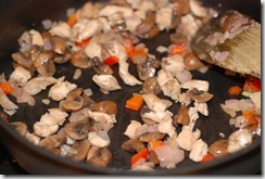 2) While the pasta is cooking, heat 3 – 4 tsp oil/butter in a wide pan. Add the chicken pieces and saute for a few minutes until done. Transfer to a bowl. In the remaining oil, add mushroom pieces and saute for a few minutes until done. Transfer to a bowl.