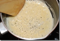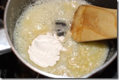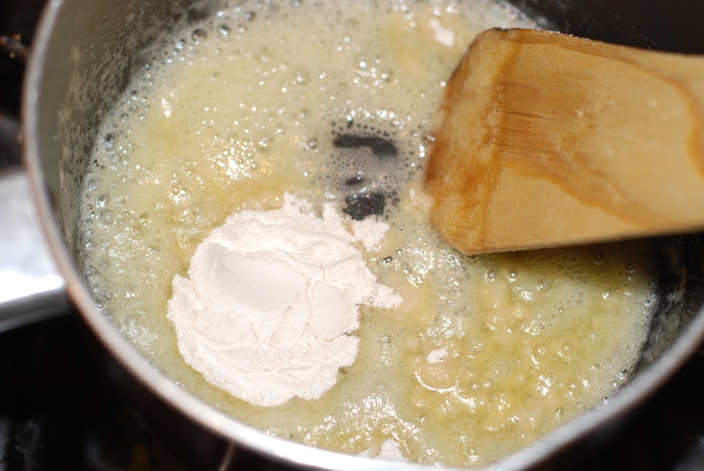 1) In a sauce pan over medium heat, add the butter and let it melt. Add the flour and cook for a couple minutes or until there are no lumps.