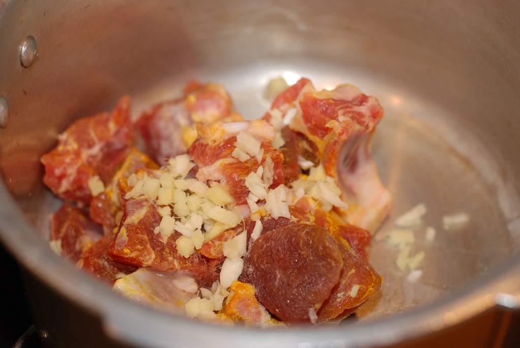 1. Marinate the mutton pieces with ingredients numbered 1 for at least 30 minutes. Pressure cook mutton for 4 whistles or until soft and done.
