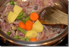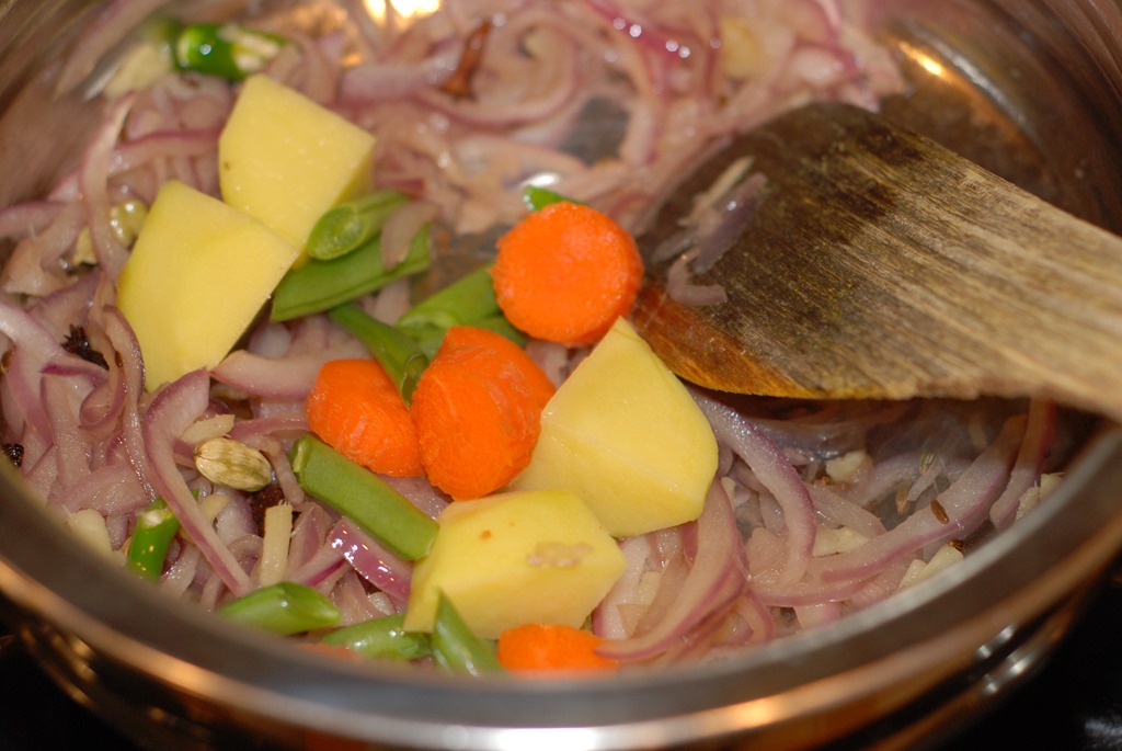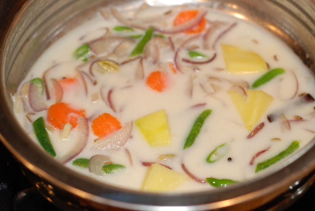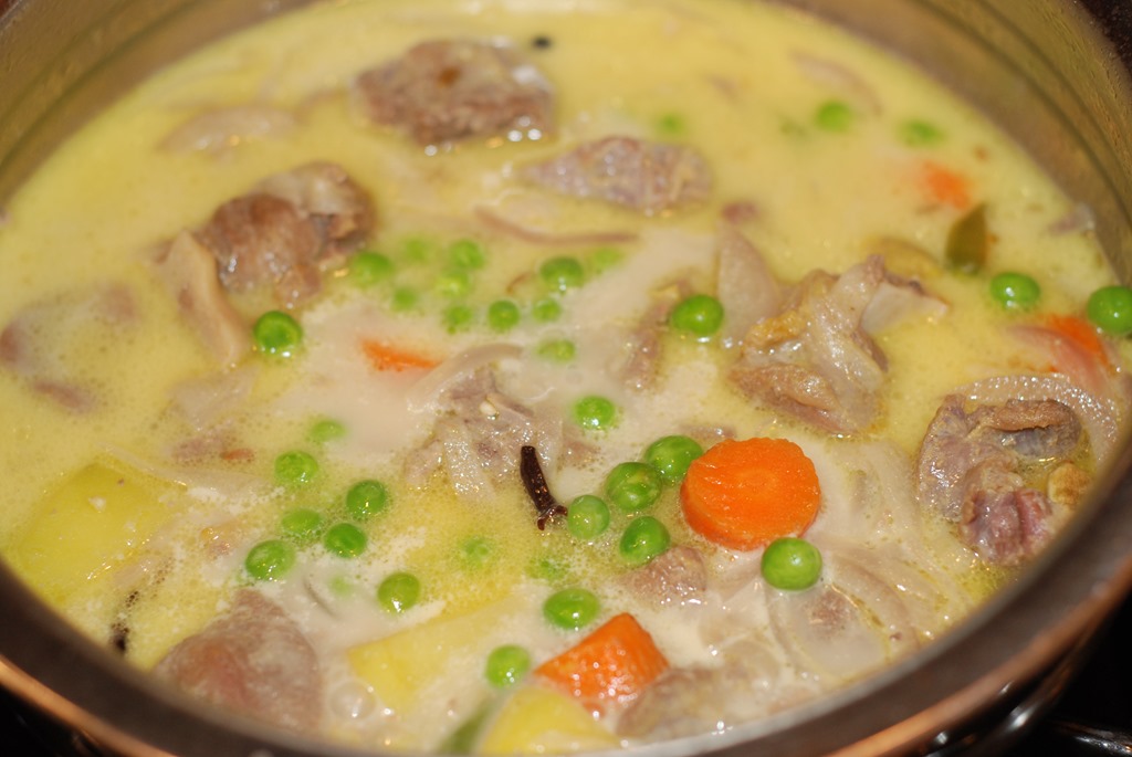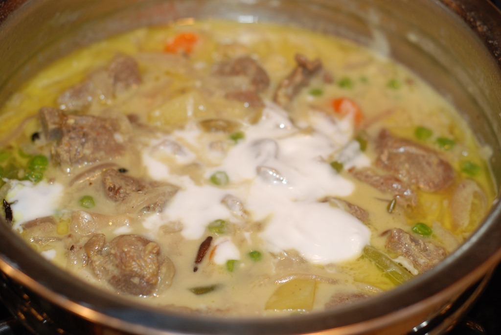 2. Heat coconut oil in a pan at medium heat. Add whole spices and stir until fragrant. Add onion and saute until transparent. Next add ginger, green chilly and curry leaves. Saute for a minute or two. Add carrot, potato, green beans and salt. Saute for a minute. Add thin coconut milk, 1/2 tsp garam masala powder and cook covered for 3 – 4 minutes. Add the pressure-cooked mutton with gravy and fresh green peas. Mix well and continue cooking for a few more minutes until vegetables are done. Taste-check for salt. Add thick coconut milk and cook for a minute. Sprinkle freshly crushed pepper corns and a pinch of garam masala powder. Switch off.