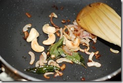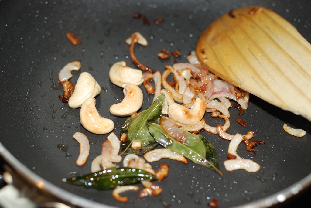 3. Heat coconut oil in a small pan. Add sliced pearl onions and saute until light golden. Add cashews, curry leaves and saute until golden. Pour over the curry. Cover and set aside for 20 minutes. Serve with appam, idiyappam, chapathi etc.