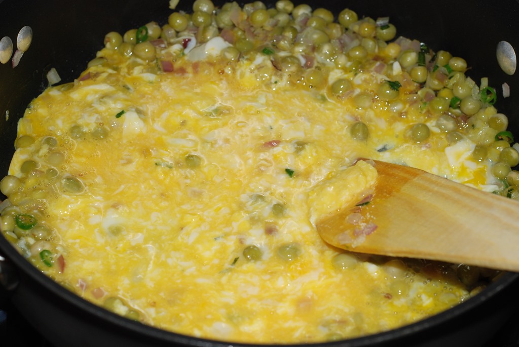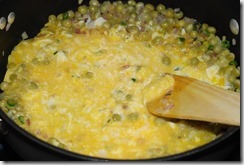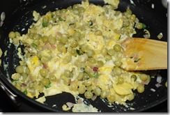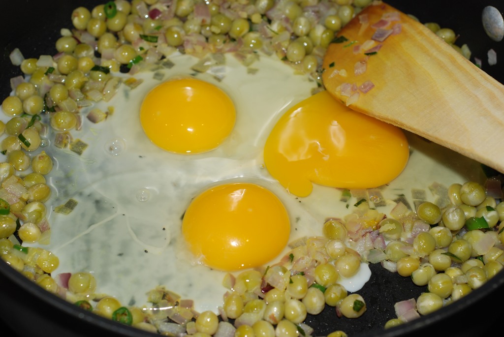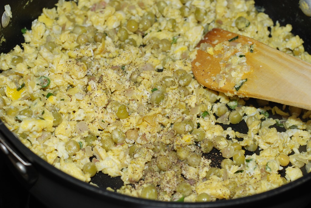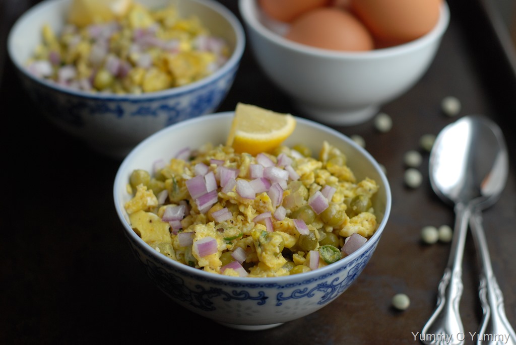 Heat coconut oil in a pan. Add onion, ginger, green chilies, curry leaves, little salt and saute until onion turns transparent, around 1 – 2 minutes. Add cooked green peas and stir for a minute. Add a pinch of turmeric powder and mix well. Next break 3 – 4 eggs into the pan and scramble well. Add a pinch of pepper powder, few drops of coconut oil or little butter and mix well. Yummy peas mutta fry is ready to serve! Serve immediately with chopped red onion and lemon wedges. Enjoy!!