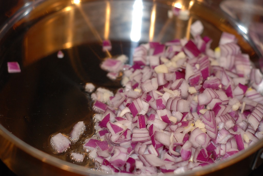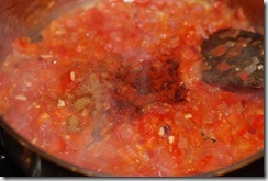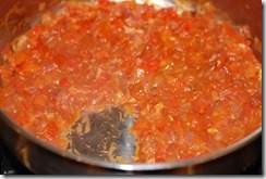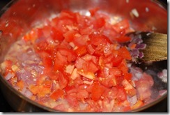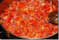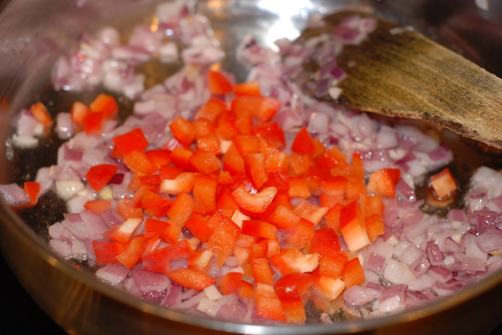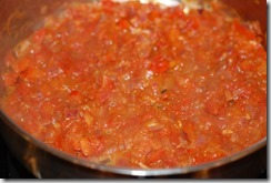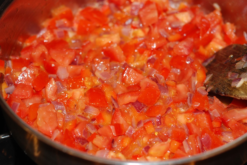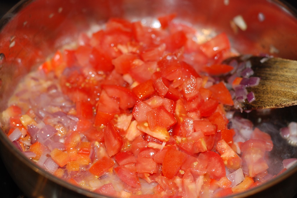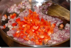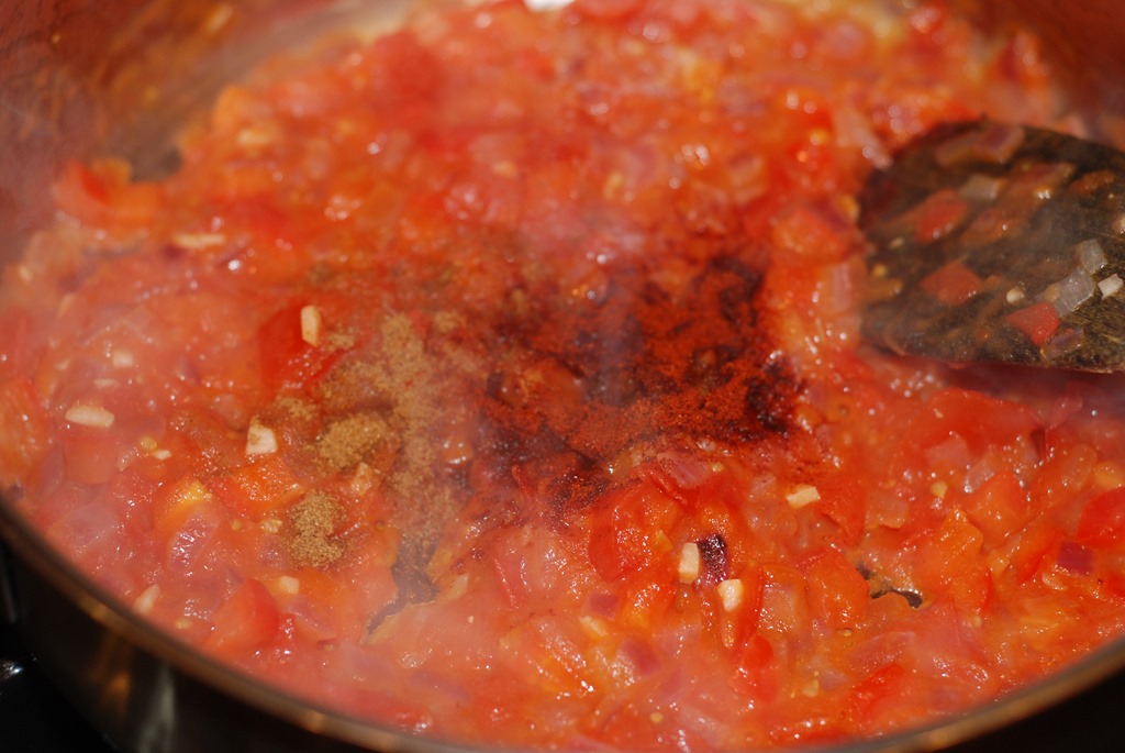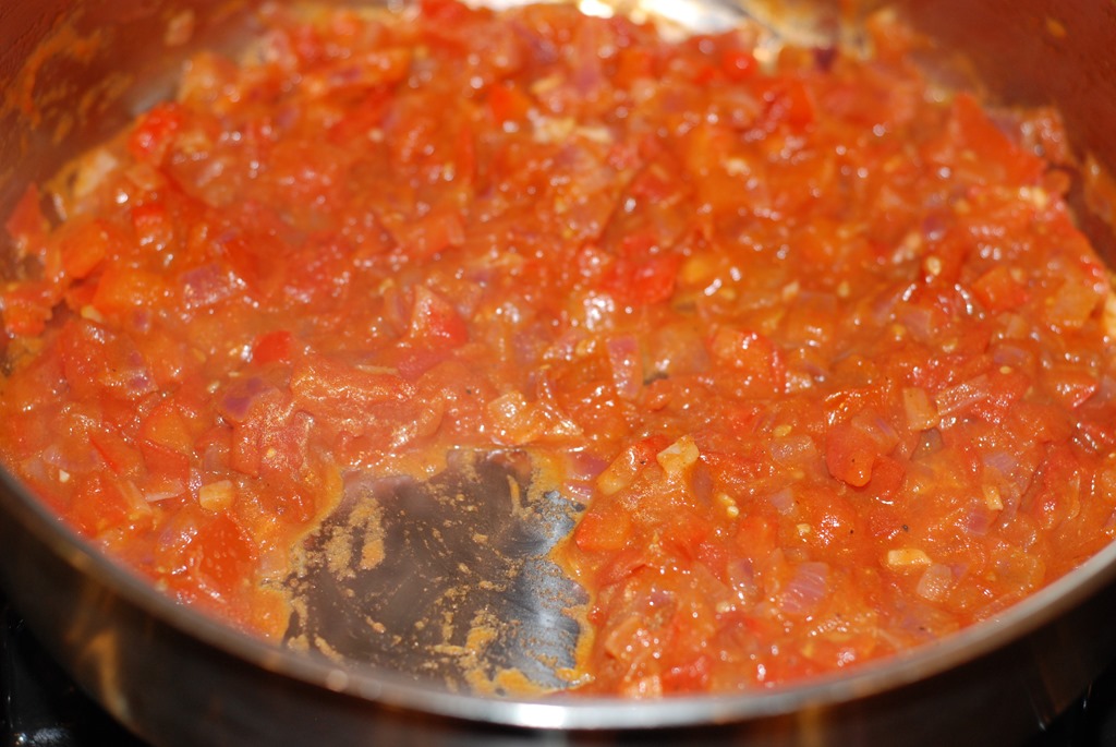 1. Heat oil in a skillet at medium-high heat. Add onion, garlic, little salt and saute until onion turns translucent. Add red bell pepper and saute for 2 – 3 minutes. Next add tomatoes and cook for 5 – 7 minutes until mushy. Add salt, a pinch of sugar, cumin powder, paprika and pepper powder. Cook for a few minutes.