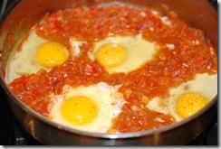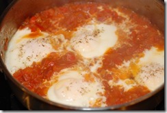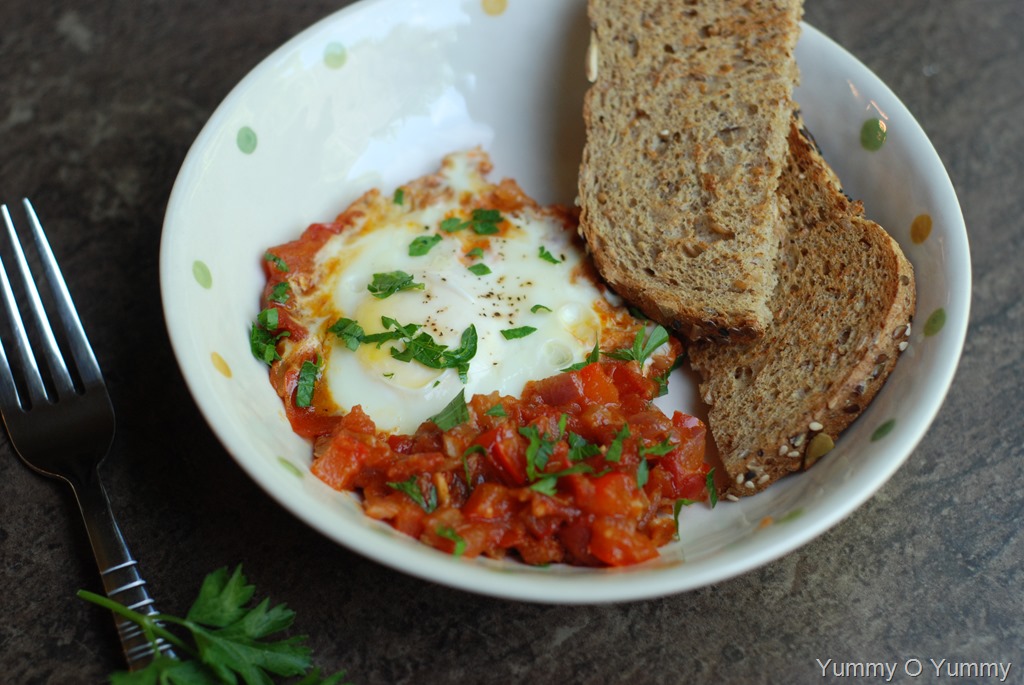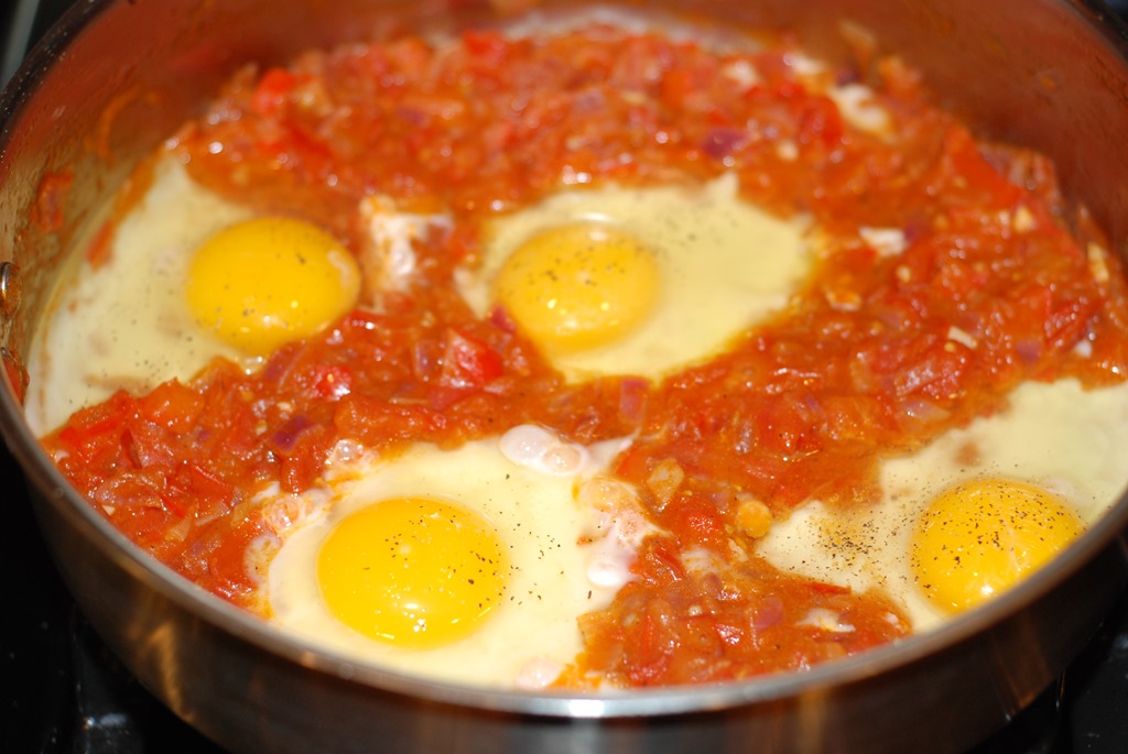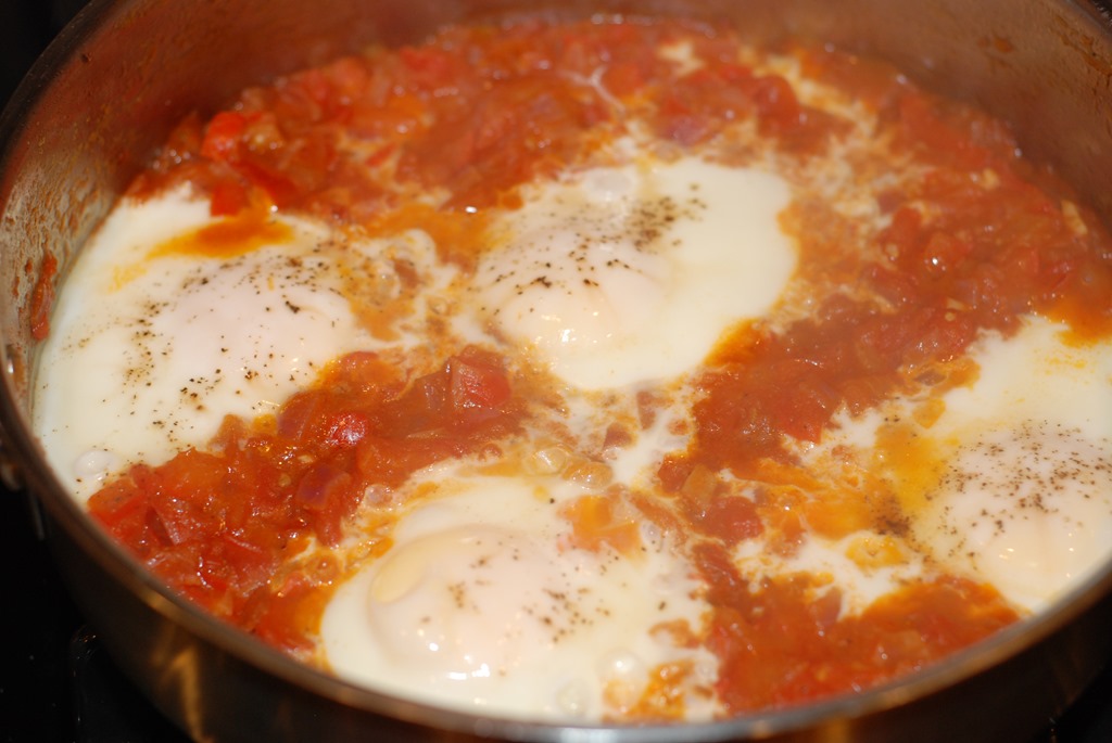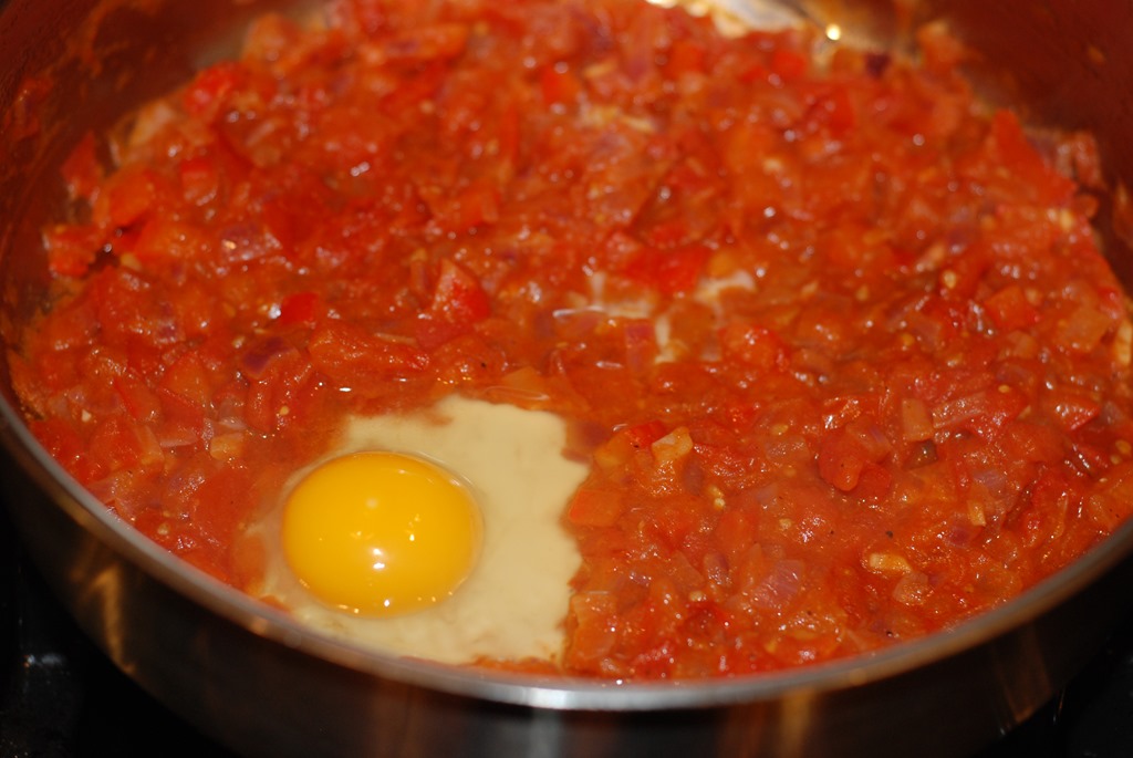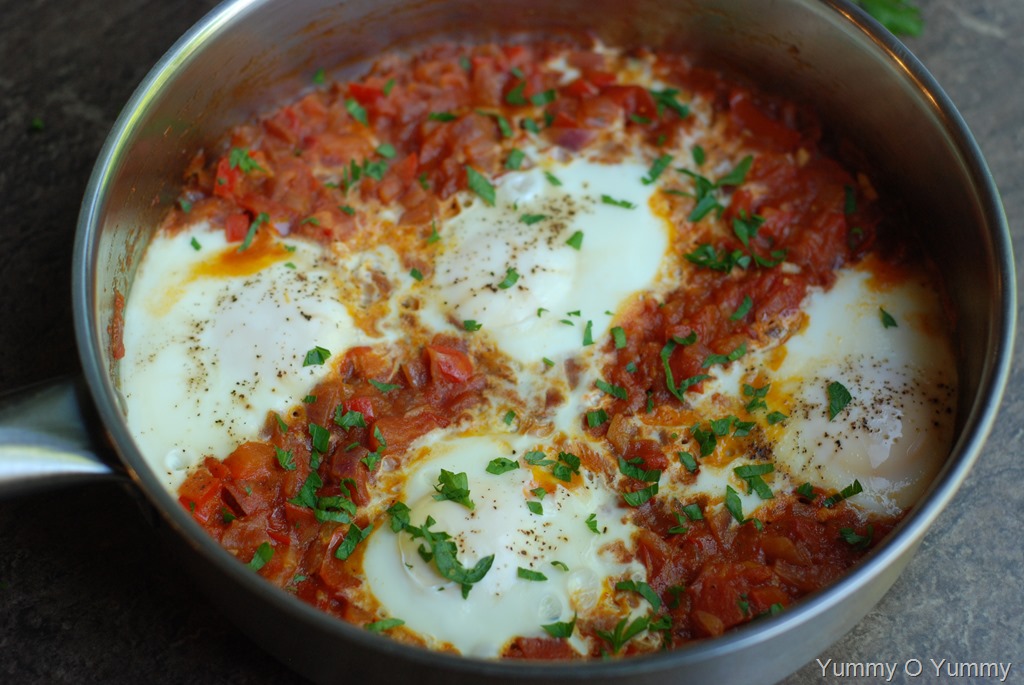 2. Make 4 wells/holes (space them evenly) in the sauce using the spatula or a spoon. Crack the eggs into the holes one at a time. Sprinkle a tiny pinch of salt and pepper over the eggs. Cook covered at low or low-medium heat for 5 – 7 minutes until eggs are well-done or until the eggs are done to your liking. Pour 1 – 2 tsp of extra virgin olive oil, sprinkle fresh chopped parsley and feta cheese, if you like. Serve immediately with toasted bread or pita bread and hummus. Enjoy!!