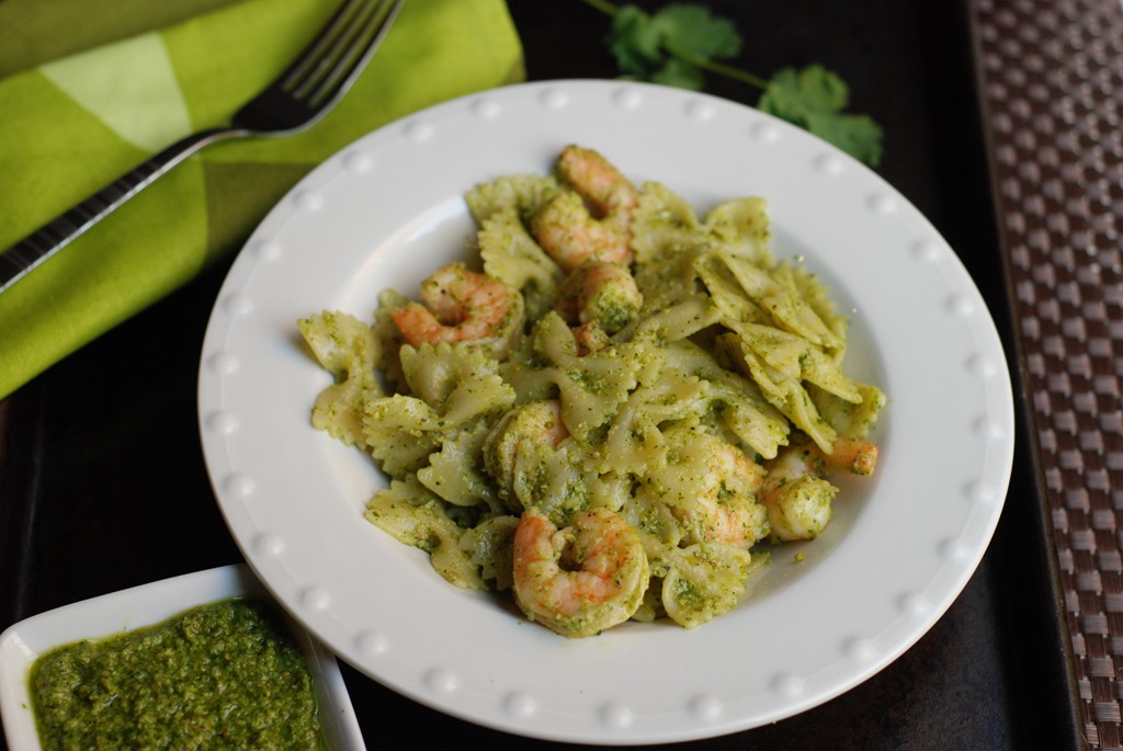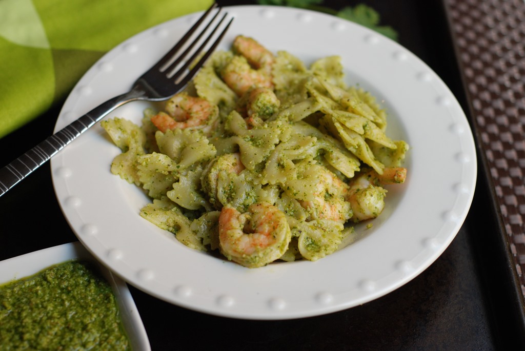 2. Meanwhile heat 1 tbsp olive oil in a pan at medium-high heat. Add chopped garlic and stir for a minute until fragrant. Add shrimp. Season with salt and pepper. Cook for 3 – 4 minutes until they are done. Add the cooked pasta and 2 tbsp pesto. Switch off. Toss well. Switch off. Serve immediately!