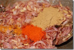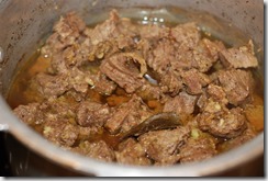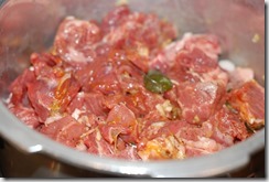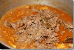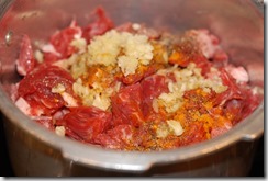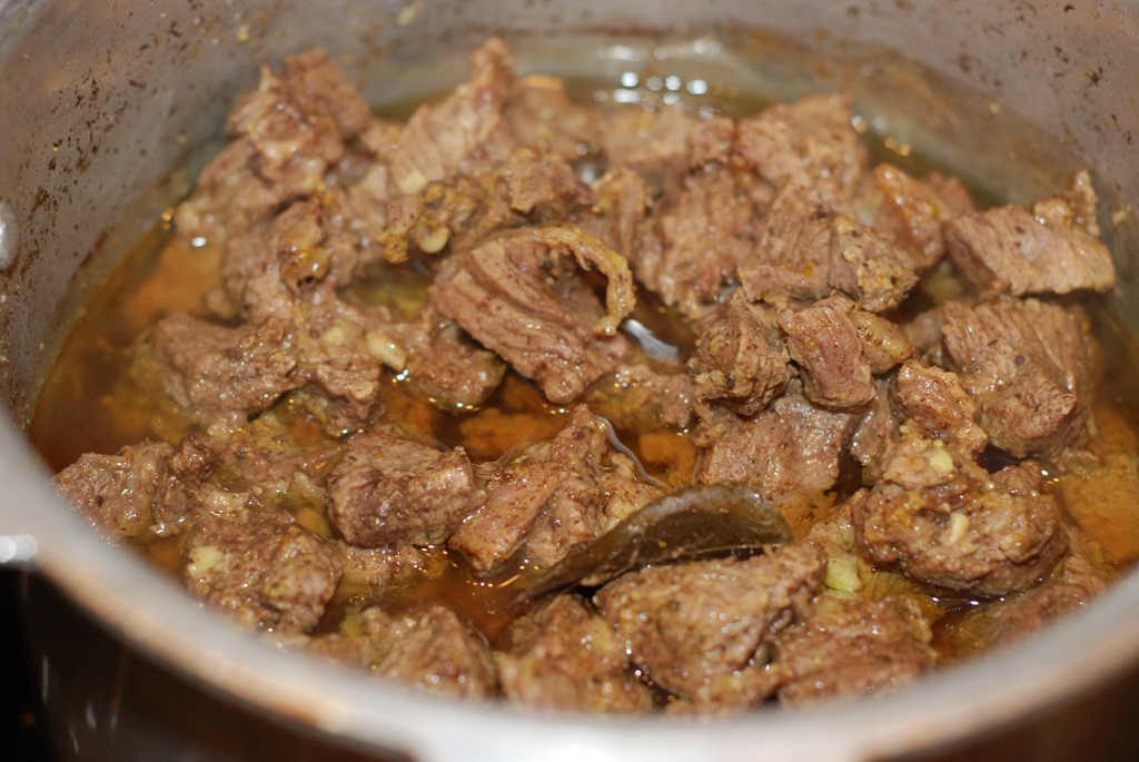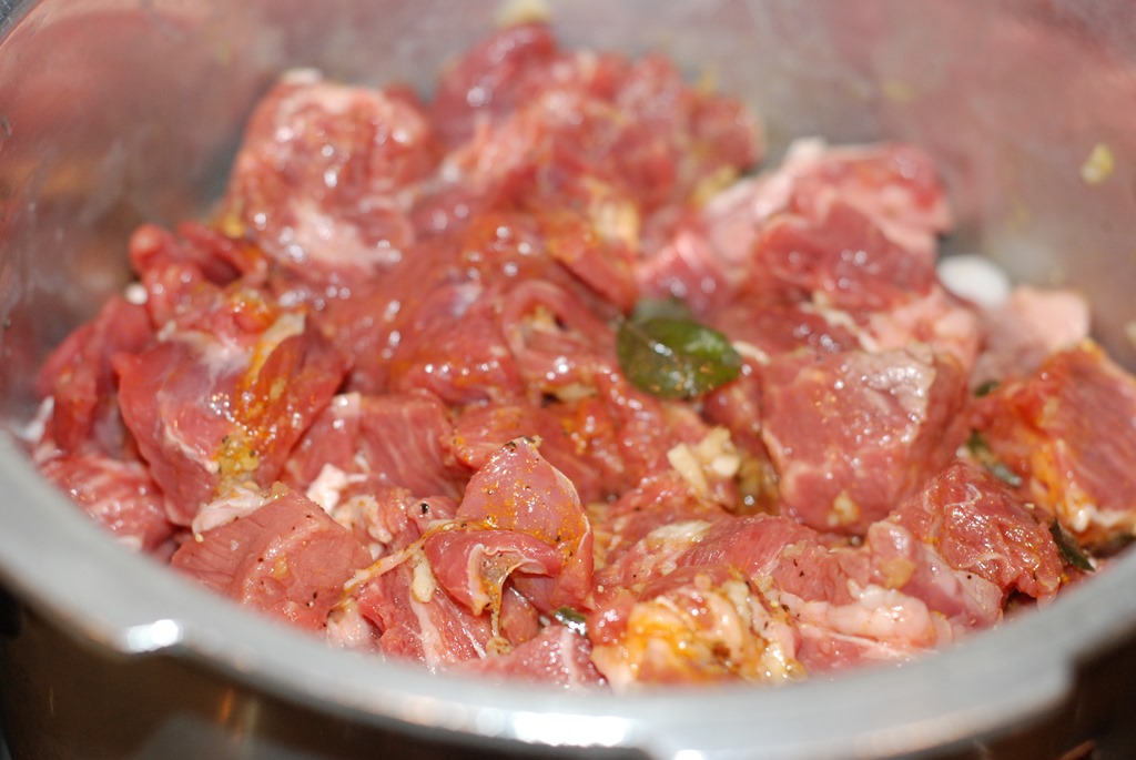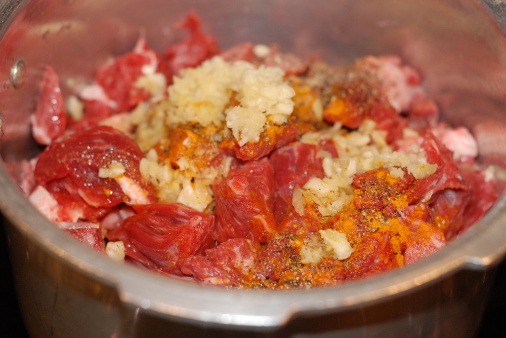 1. Combine the beef pieces with the other ingredients numbered 1. Add 1/4 cup water and mix well. Pressure cook for 3 – 4 whistles over medium flame until soft and done. Switch off.