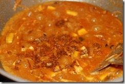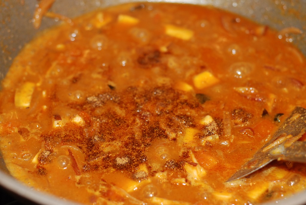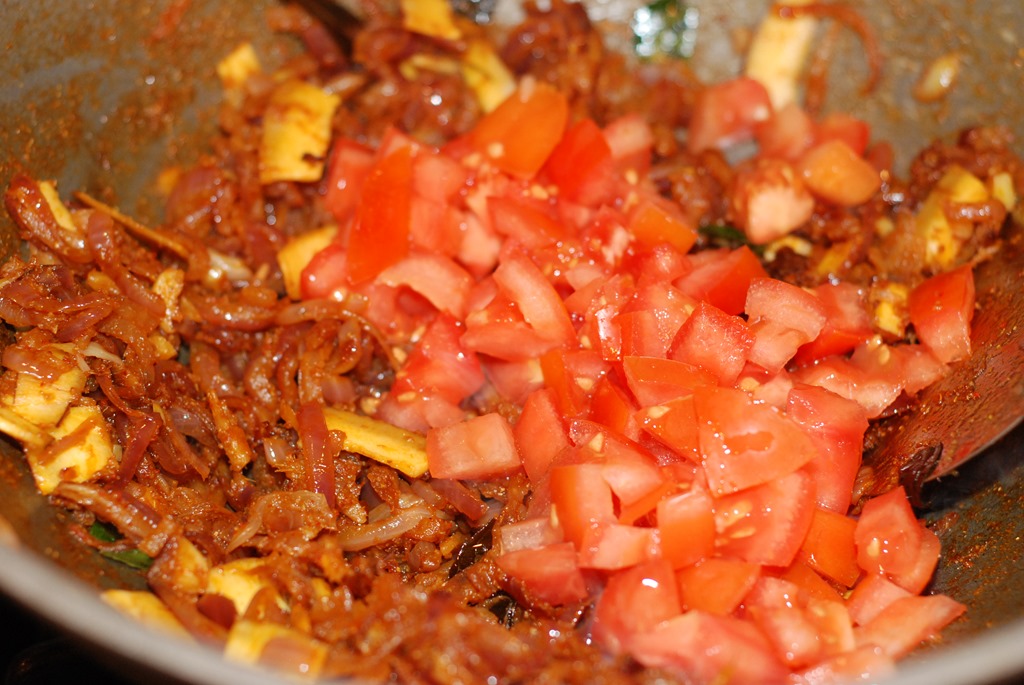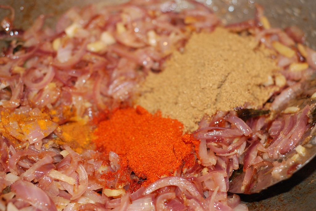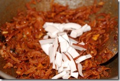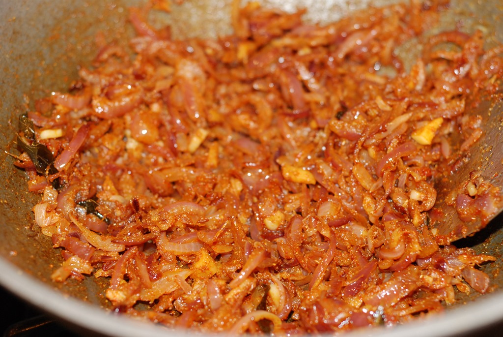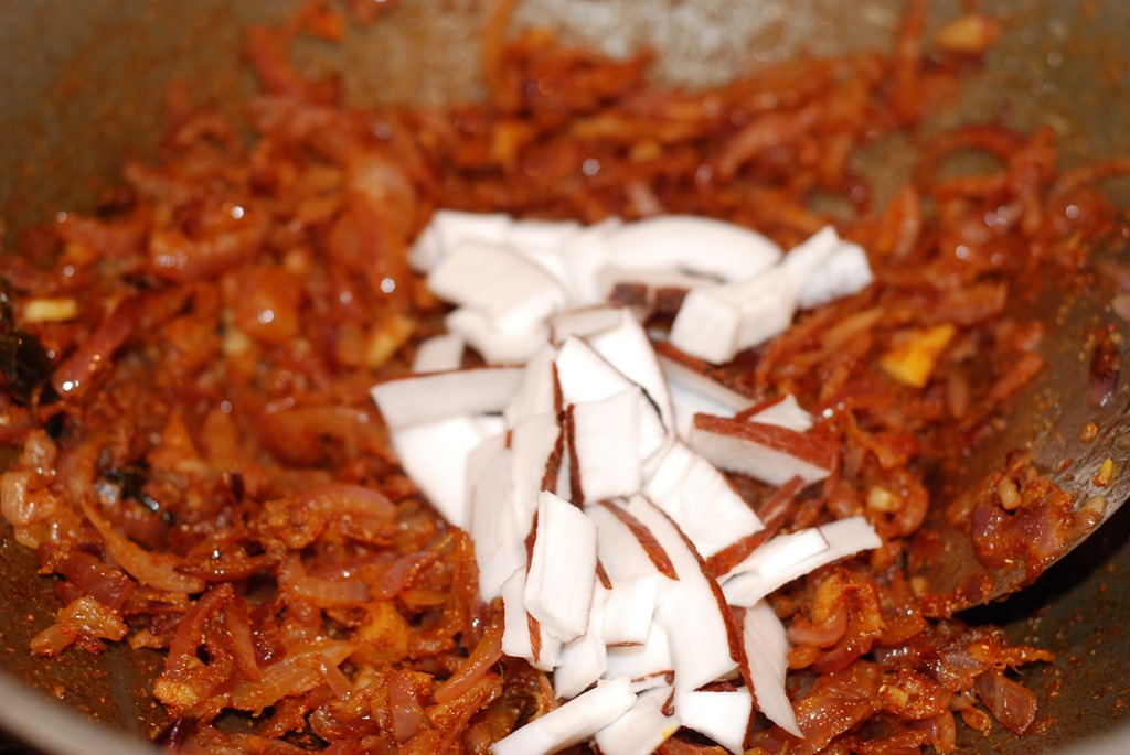 2. Heat coconut oil over medium-high heat in a pan or kadai. Add sliced onion, little salt and saute until translucent. Add ginger, garlic, green chilly and curry leaves. Continue to saute until golden. Bring down the heat to low. Add turmeric powder, chilly powder, coriander powder and 1/2 tsp garam masala powder.  Cook until their raw smell disappears. Add sliced coconut and  mix well. Add tomato pieces and cook for a few minutes until they get mashed up. Add the beef pieces along with gravy. Mix well. Add 1/2 – 1 cup hot water. Mix well and bring to a boil. Add 1 – 1.5 tsp garam masala powder and salt, to taste. Cook covered for 10 – 15 minutes until gravy turns thick and oil separates on top. Switch off the flame.