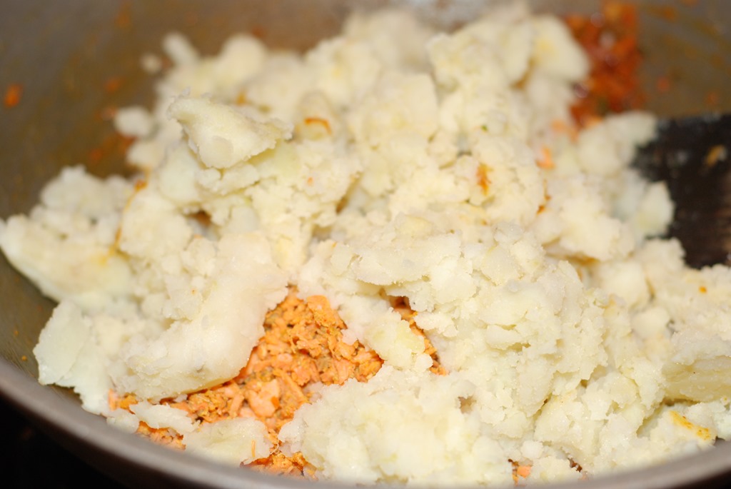 3. Heat 1.5 tbsp oil n a pan/kadai. Add finely chopped onion, ginger, garlic, green chilly and curry leaves. Saute until onion starts to change color. Add the spice powders numbered 5  and cook for a few seconds until their raw smell leaves. Add cooked fish and saute until dry. Add mashed potatoes and mix well. Taste check for salt. Cook for a minute and switch off. Cool down the mixture.