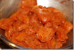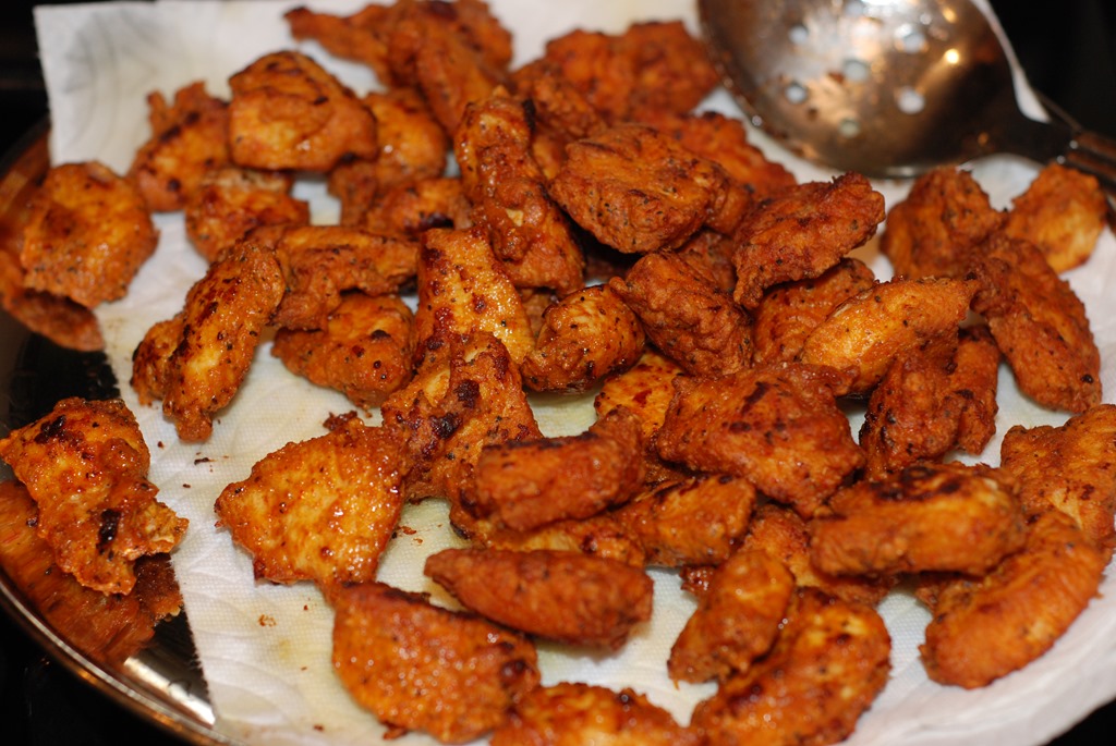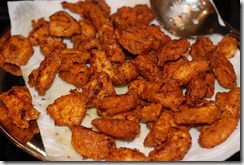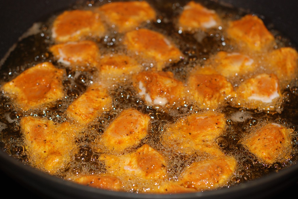 3. Heat oil in a pan over medium-high or high heat and fry the chicken pieces in 2 – 3 batches for about 5 – 8 minutes until done. Transfer to a paper towel.